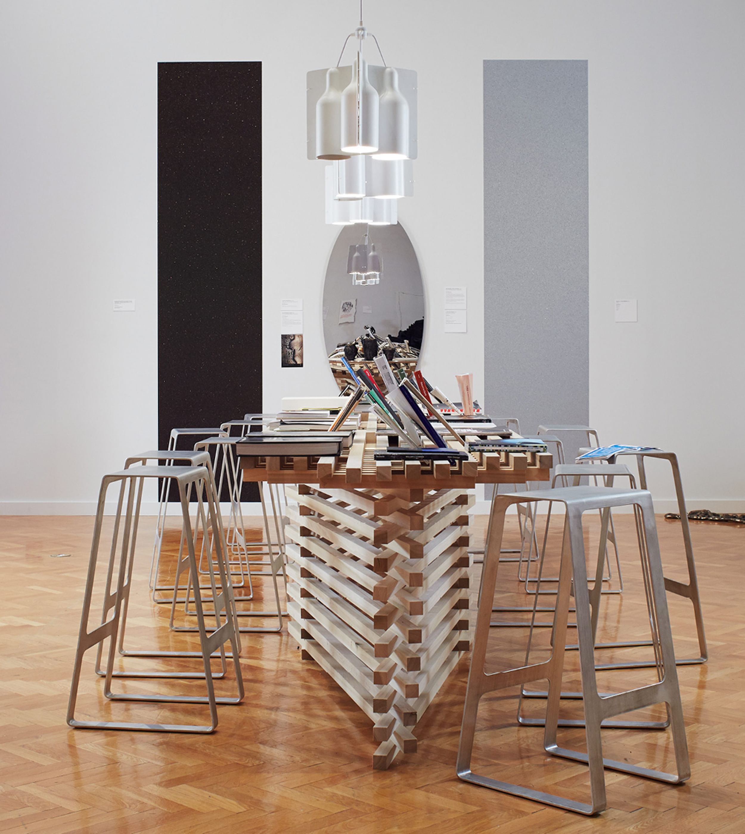 The exhibition displays were designed by Tim Parsons, Associate Professor of Designed Objects at the School of the Art Institute, and in the spirit of Chicago's history of printing and manufacturing, they were built using industrial materials.