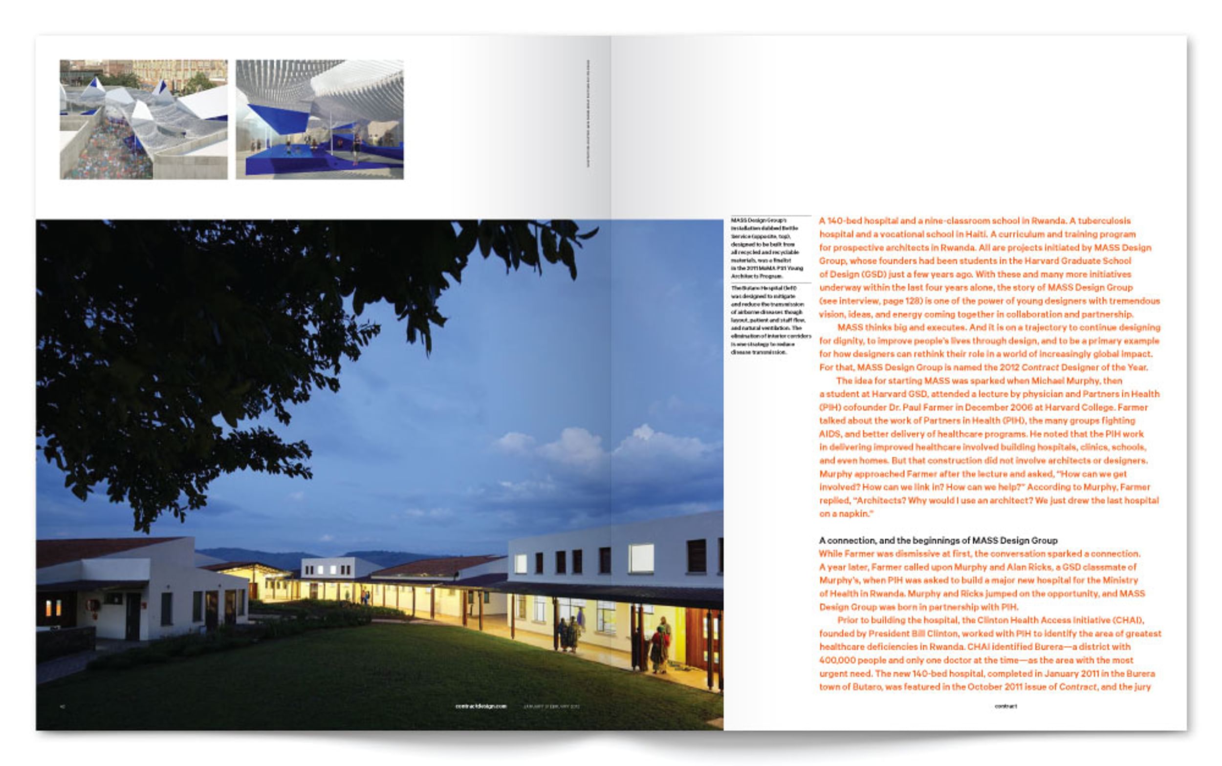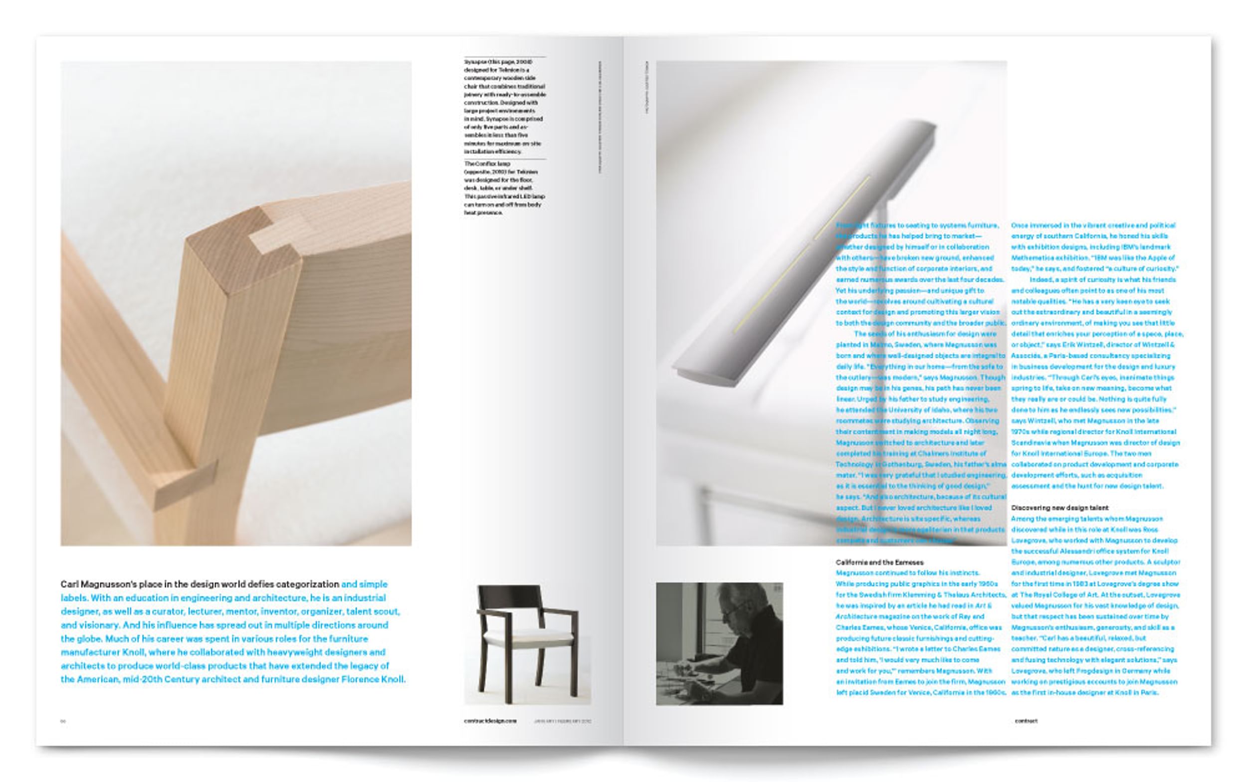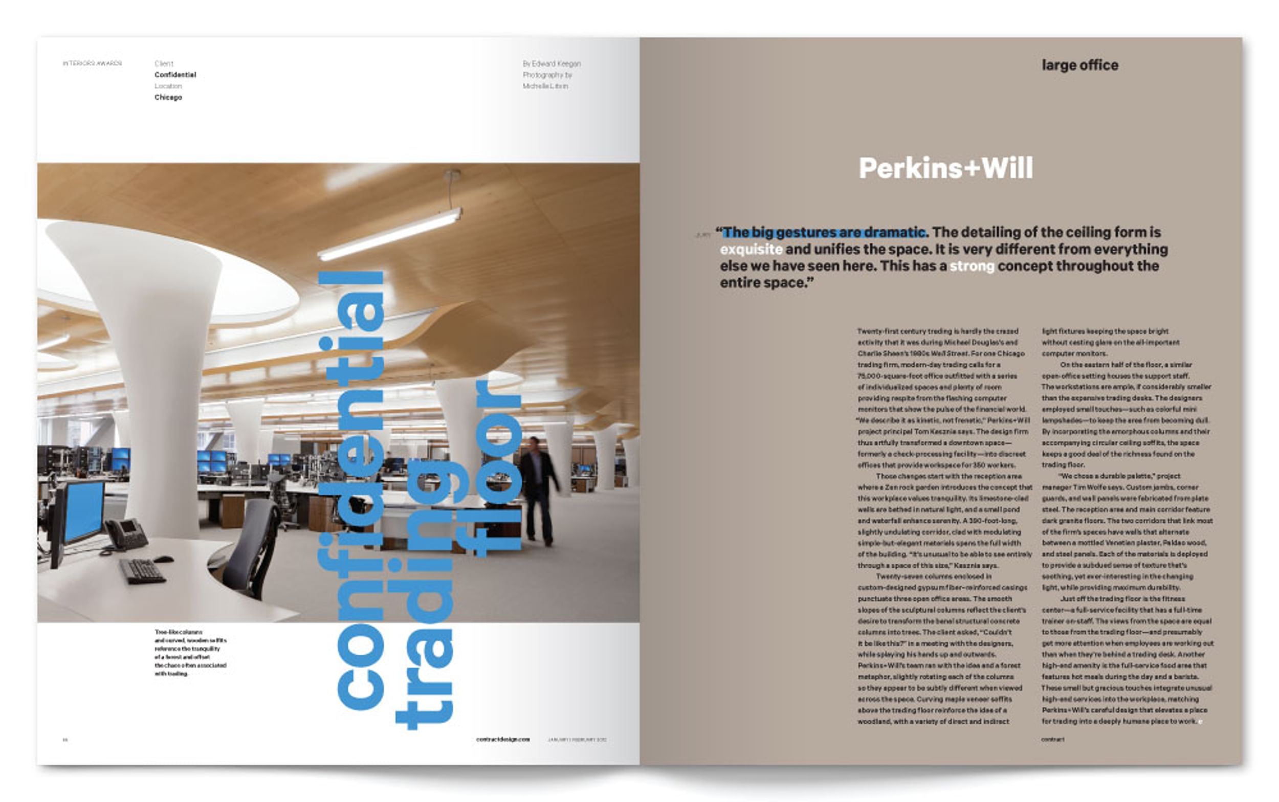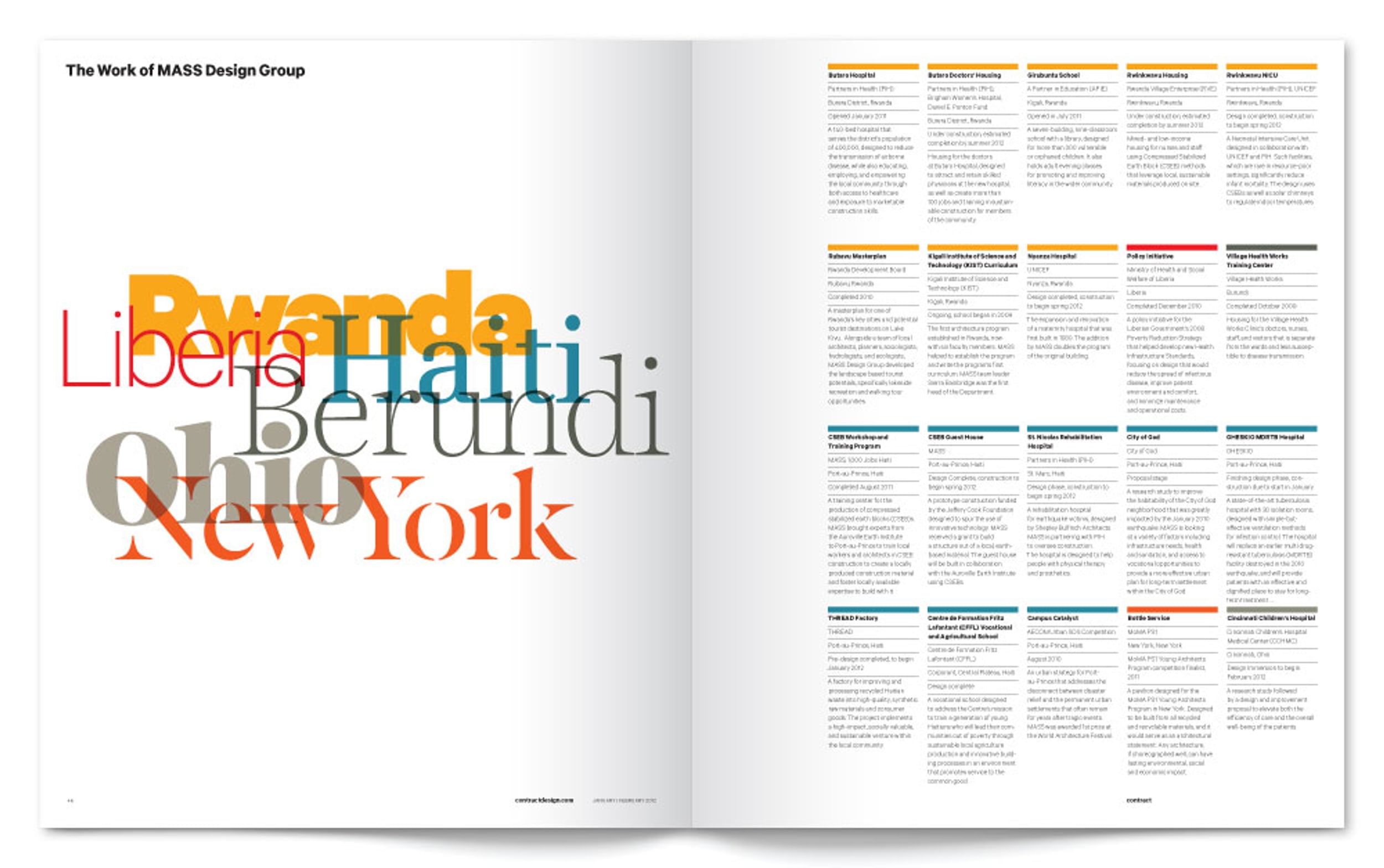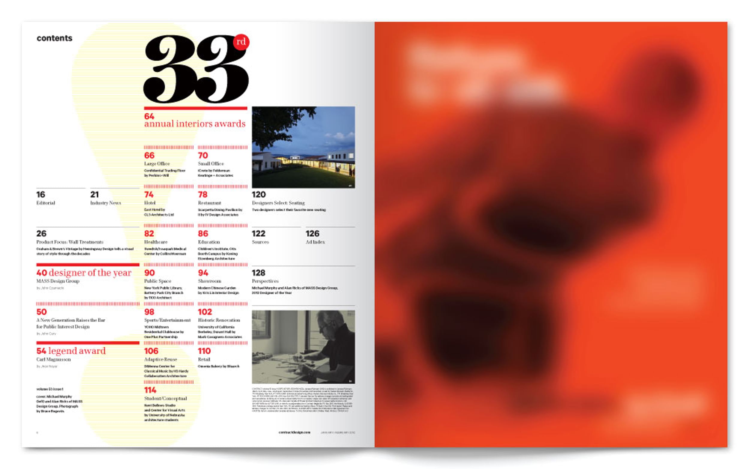 Celebrating over 50 years of service to the design industry by delivering the most intelligent content, Contract magazine has been re:imagined and re:designed. In the fall of 2011, publisher John Rouse invited Thirst to redesign their industry-leading interior design magazine. Rick Valicenti/3st, Bud Rodecker/3st, and Robyn Paprocki/3st collaborated with editor in chief John Czarnecki and his team, Sheila Kim and Jonathan Marsland, to design a simple, yet bold, system that makes the access to complex content accessible and more relevant.