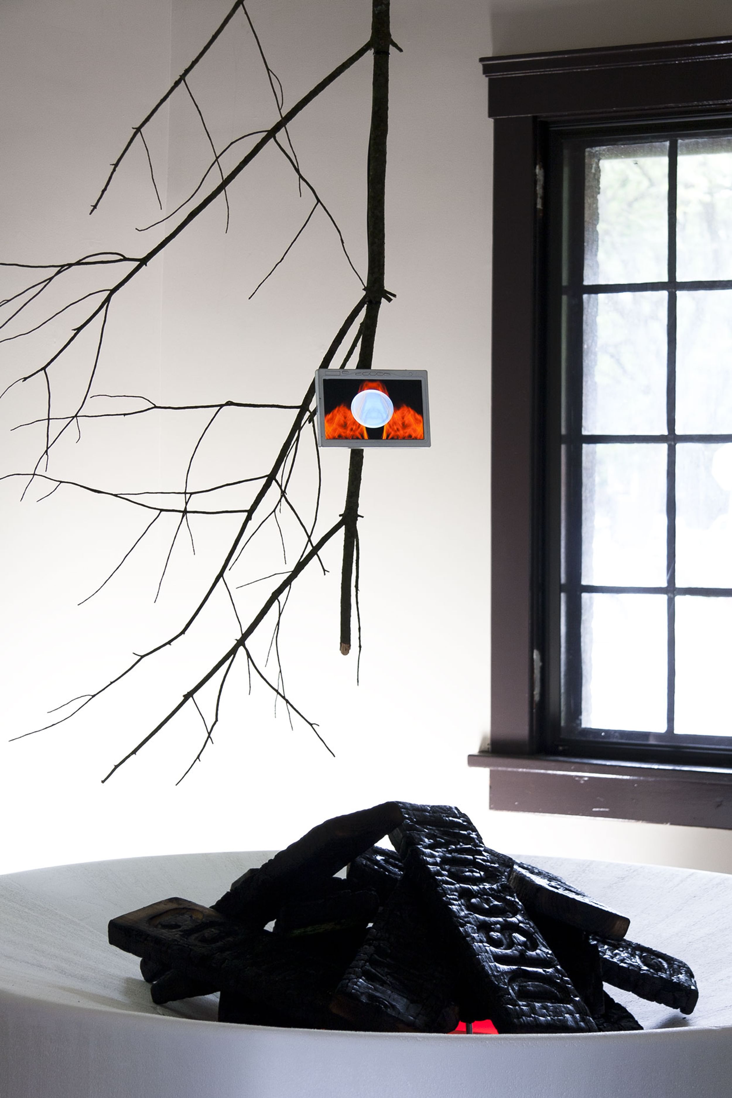 The installation features a digital marshmallow suspended above a “campfire” of burnt fragments of discomfort. Flames flicker in sync with Matthew’s voice as the marshmallow blisters, eventually transforming into ‘gold’, forged into perfection by the discomfort of an unexpected, albeit beautiful life.