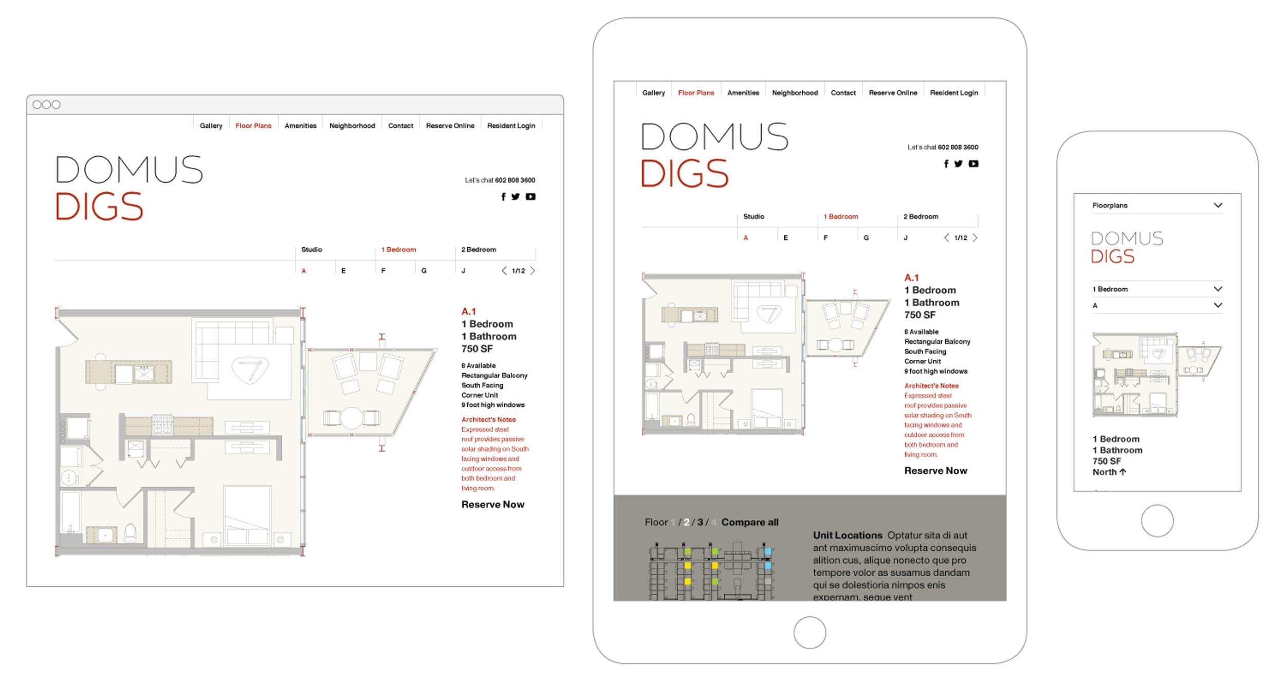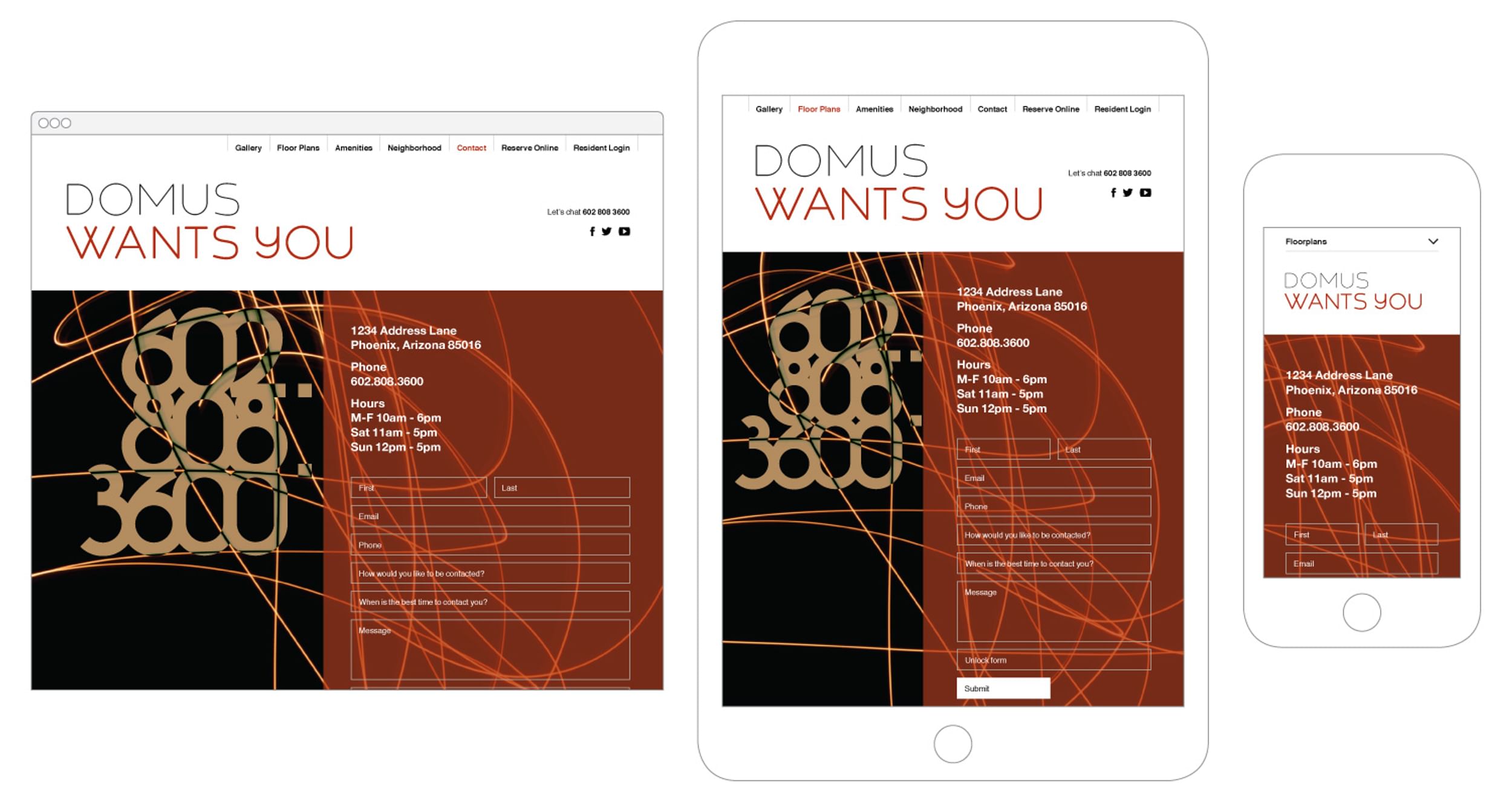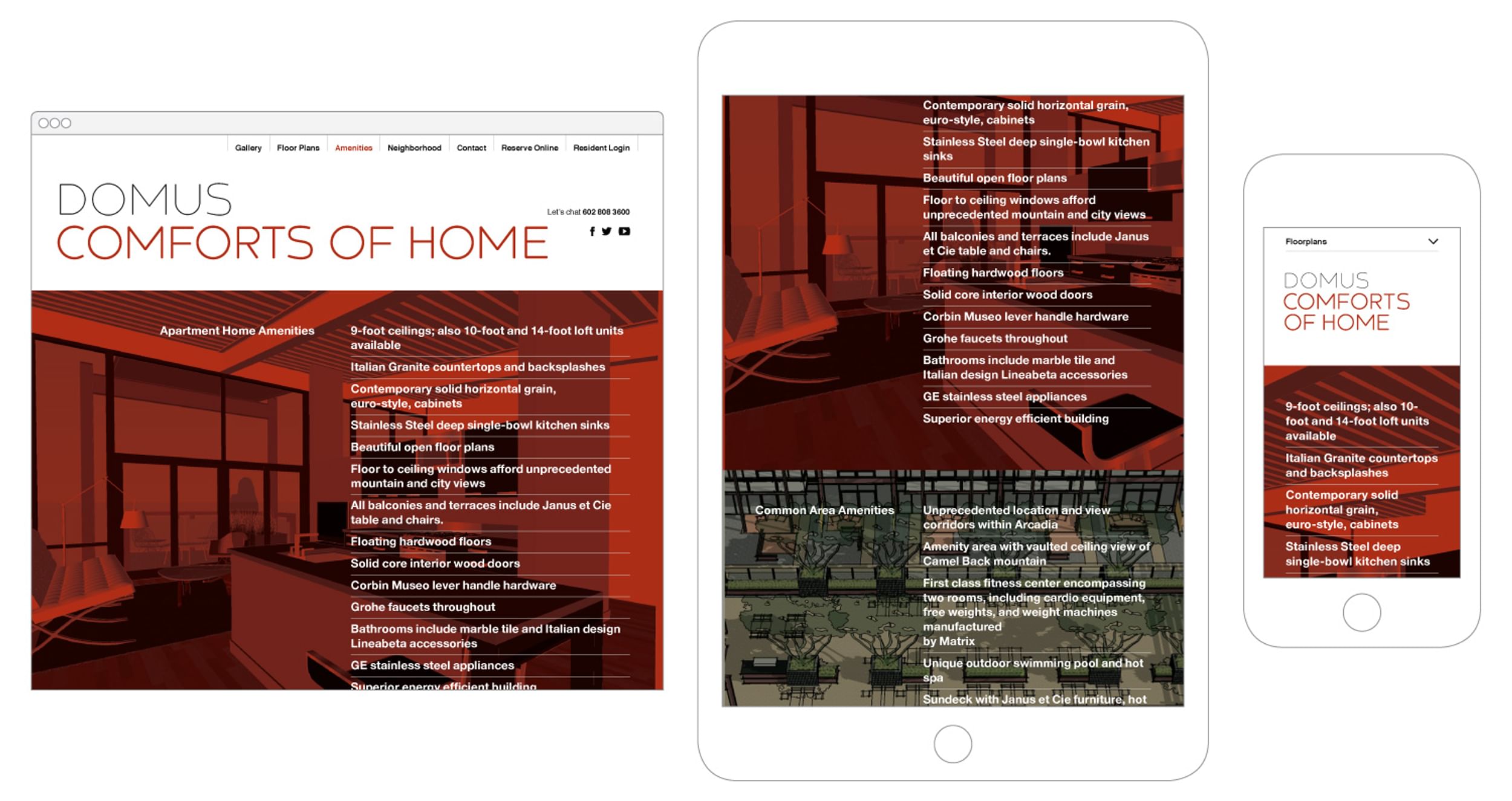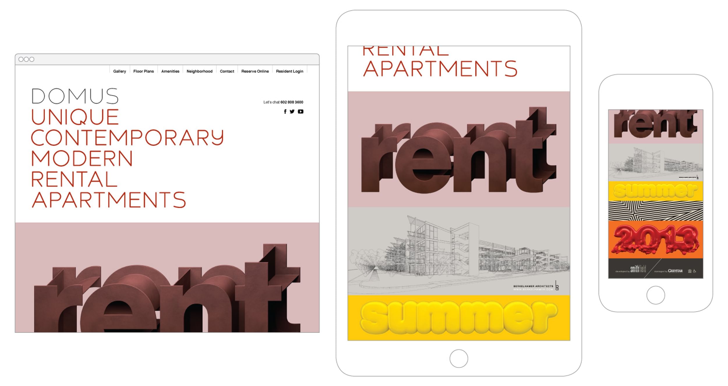 With a facade encased in high-efficiency glass and steel, Domus is unlike any other residential building in Phoenix. The principle idea behind our work is to say more with less. Every form is codified with the experience of living at Domus. Thirst built the identity around a custom typeface inspired by the steel structure of the building, and a suite of imagery that sets a visual language and is a conceptual voice for the project. This voice influences every piece of marketing collateral, from the construction barricade to the website.