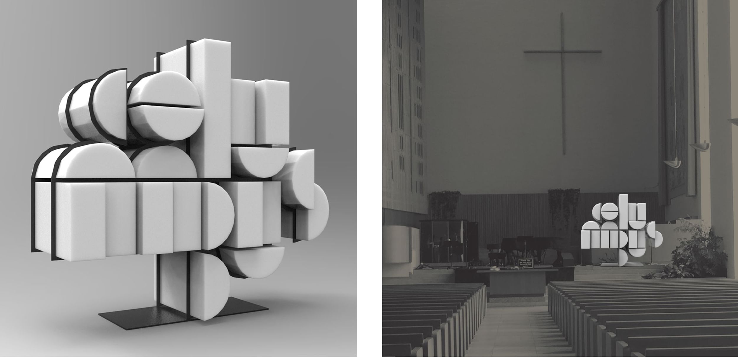 In 2014, designer, Jonathan Nesci, presented 100 Variations, New Reflections on Eliel Saarinen and the Golden Ratio, an installation in the sunken courtyard of the First Christian Church by famed architect, Eliel Saarinen. Produced by Indianapolis-based curator, Christopher West, with support from the Columbus Area Visitors Center, Columbus Museum of Art and Design, and the Haddad Foundation, 100 Variations stood as the pilot project for Exhibit Columbus.