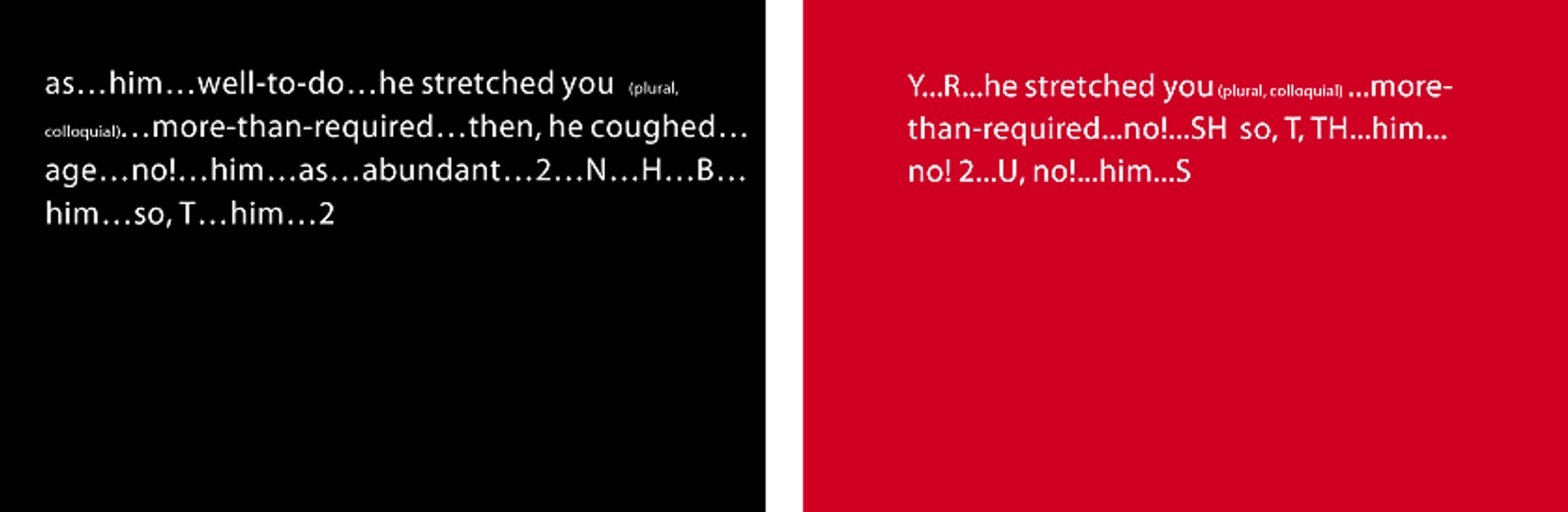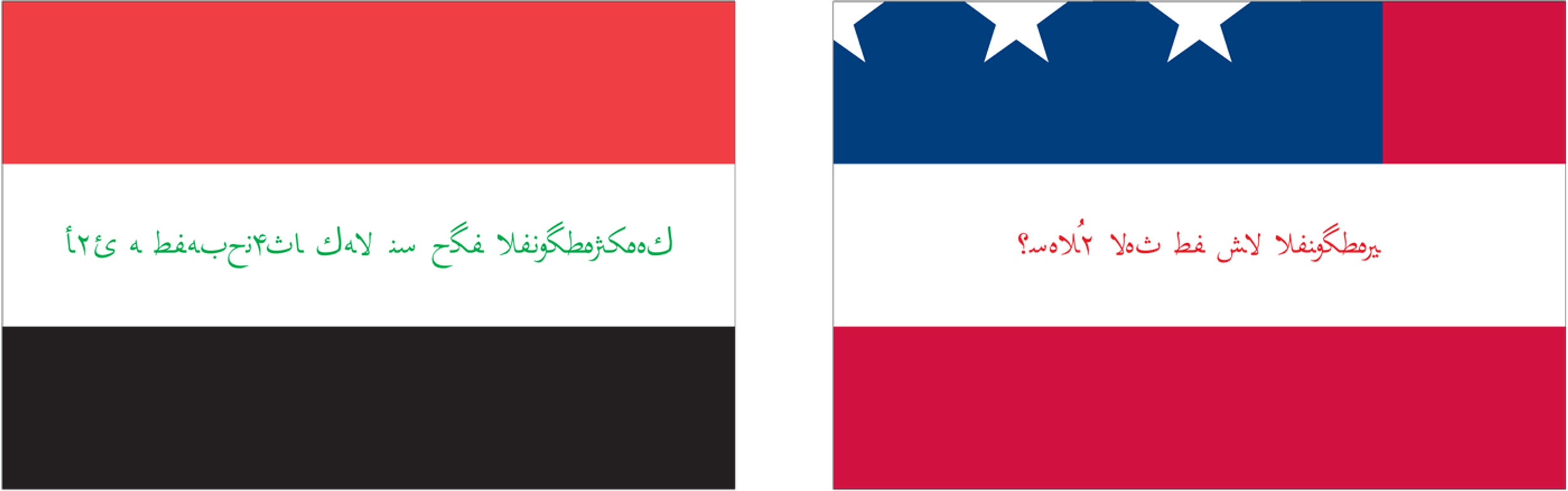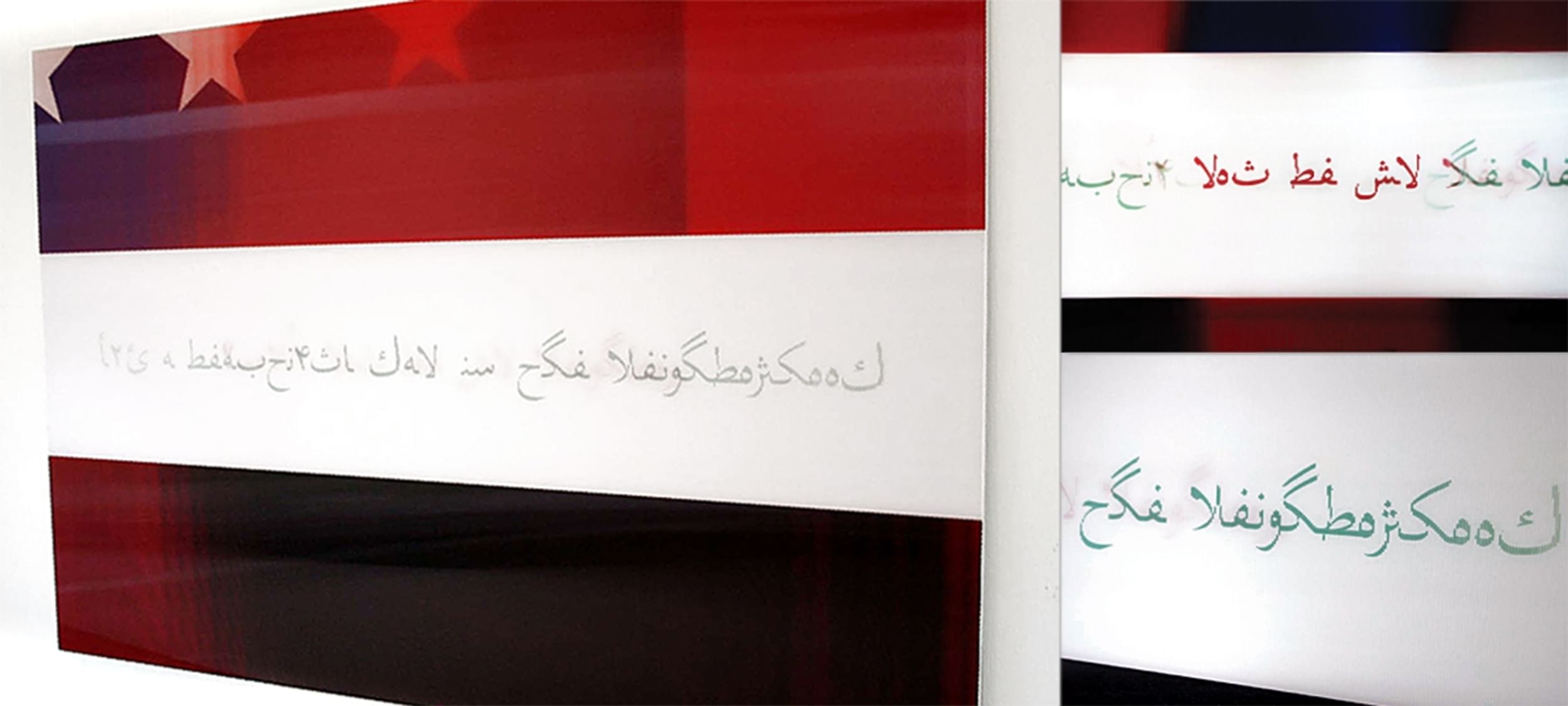 Arabic characters spell the familar phrase "It’s a beautiful day in the neigborhood..." When translated, the legible characters speak unintelligibly.