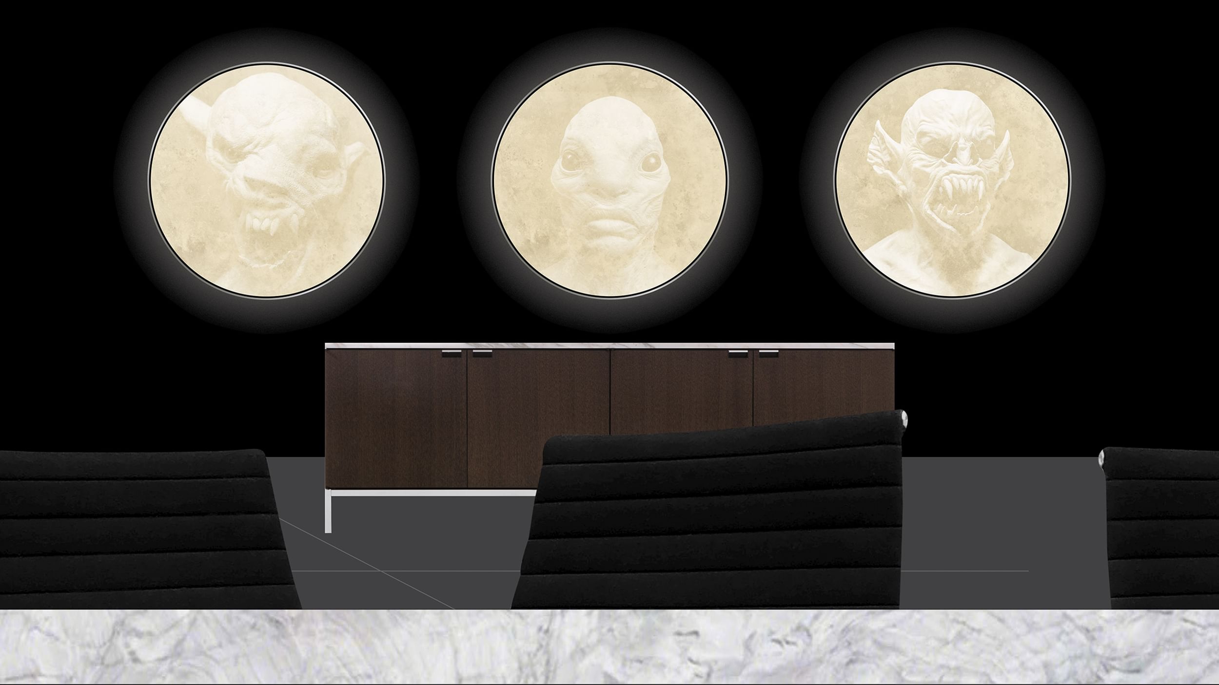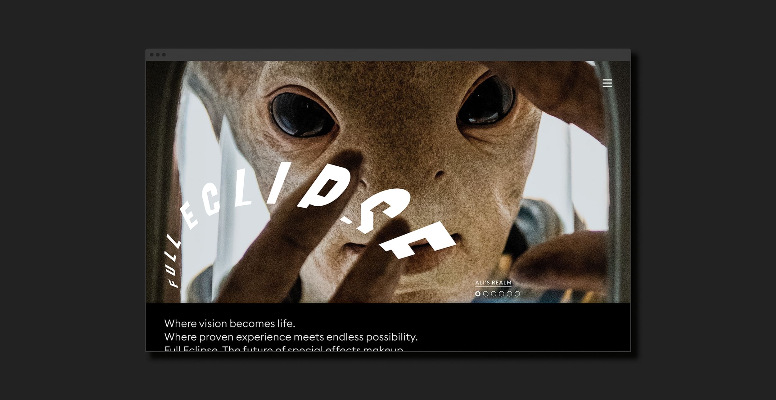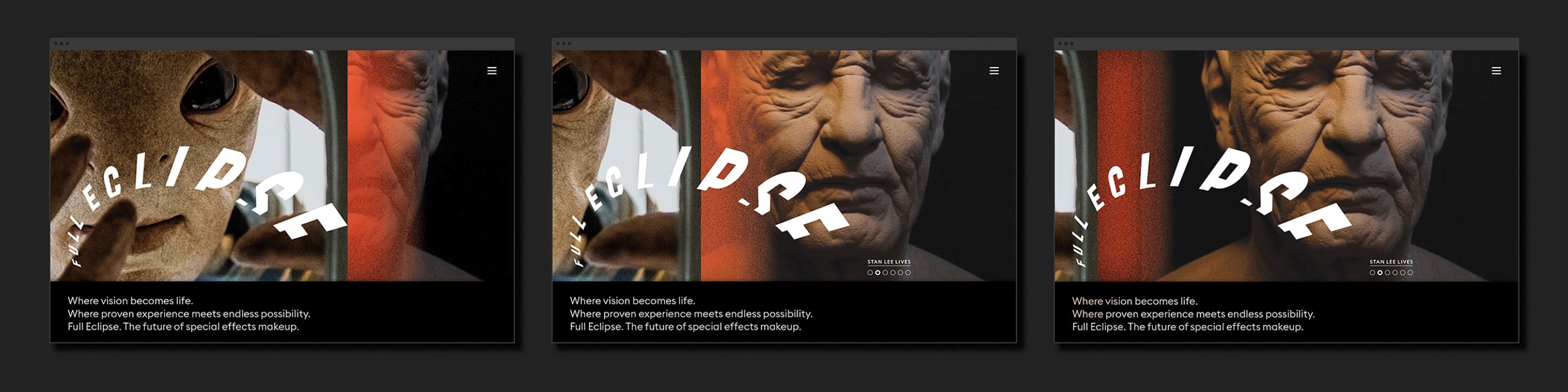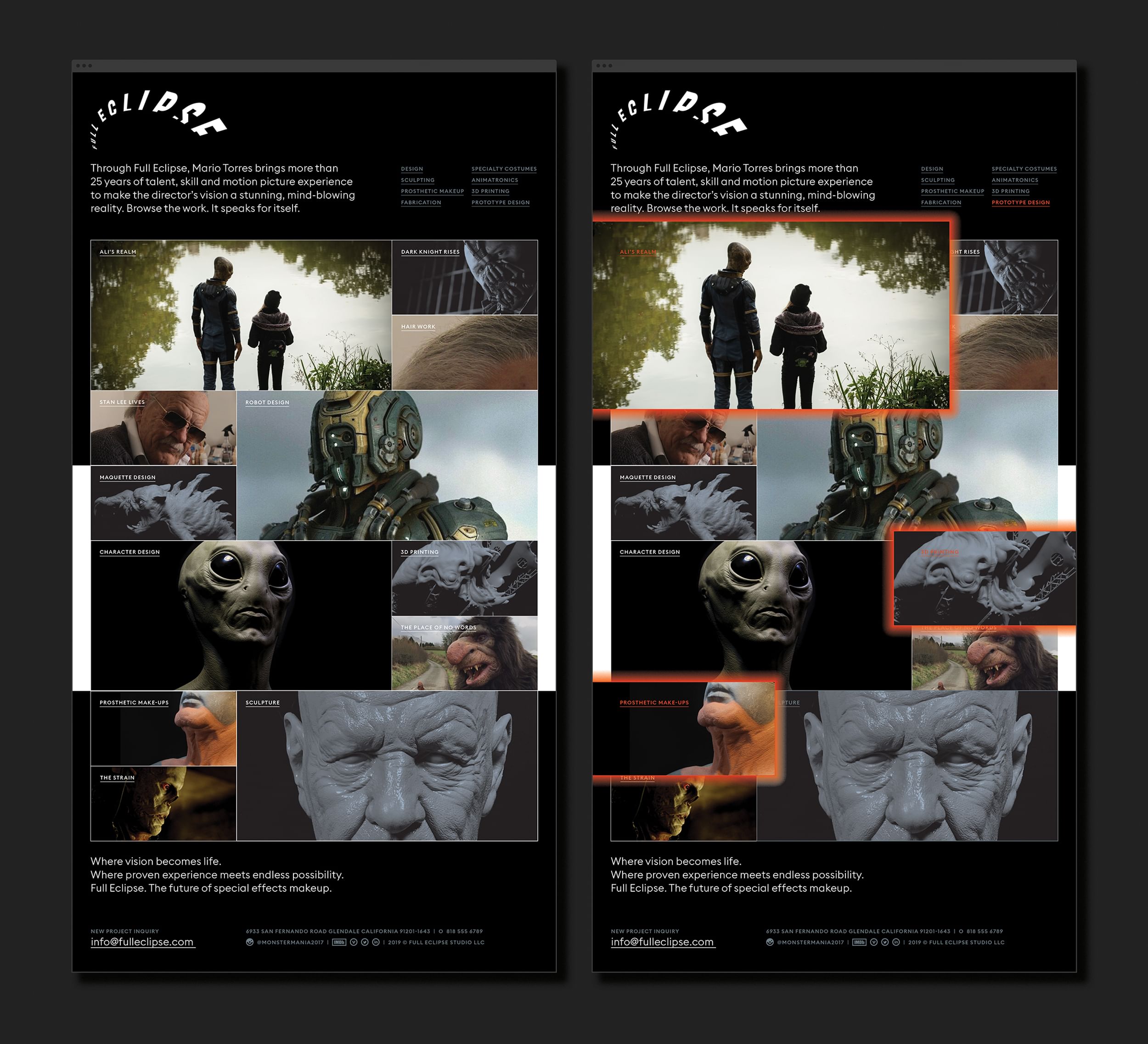 Where vision becomes life. Full Eclipse is the forthcoming character creation studio of Hollywood’s leading special effects makeup artist, Mario Torres. Thirst, led by Rick Valicenti and Nick Adam, was brought on to design a visual identity that embodied the craft and characterful essence of the practice. This identity system includes multiple sound and motion expressions, a website, environmental graphics, and custom furniture.