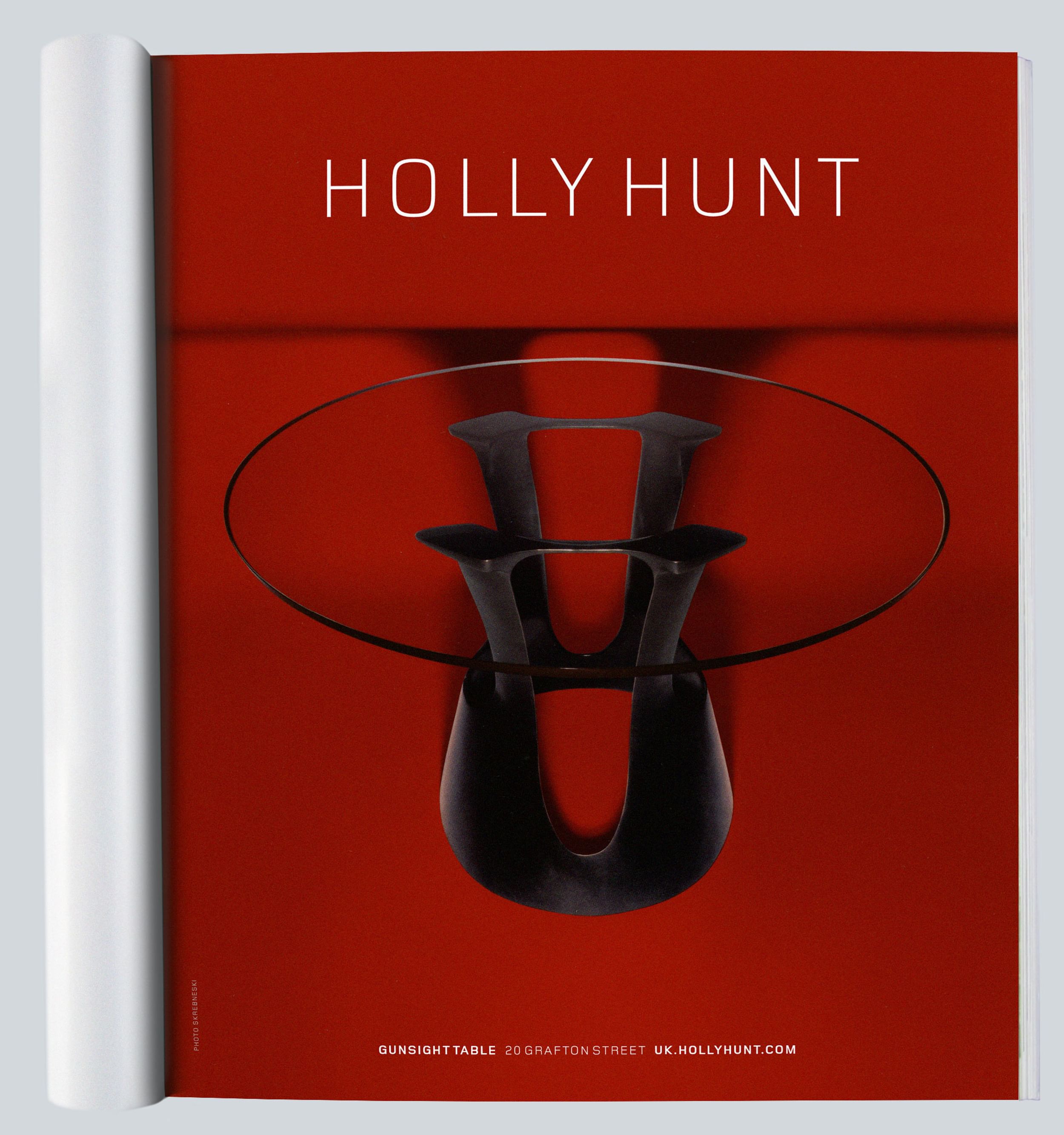Victor Skrebneski photographed the table on a white background. Rick Valicenti and Classic colored the background red. When Holly Hunt's graphic designer, Alli Leib, specified the annual toffee box, red seemed ideal. The same visual impression ran as an advertisement.