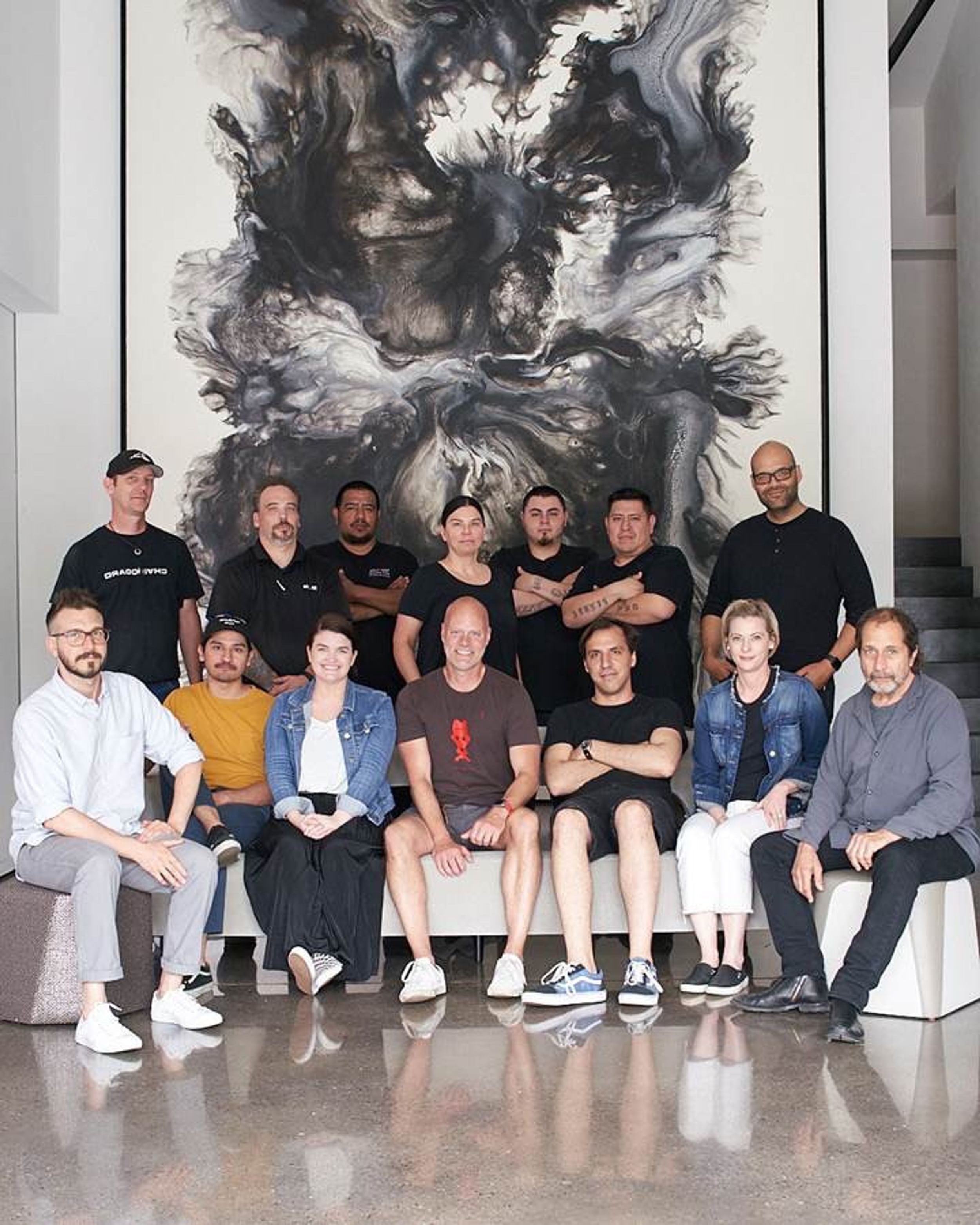 Jonathan Allen (front row, black T-shirt), furniture movers, the product designer, Alberto Valez (top row, far right), brand managers, marketing folks, an assistant or two, and a fatigued graphic designer.