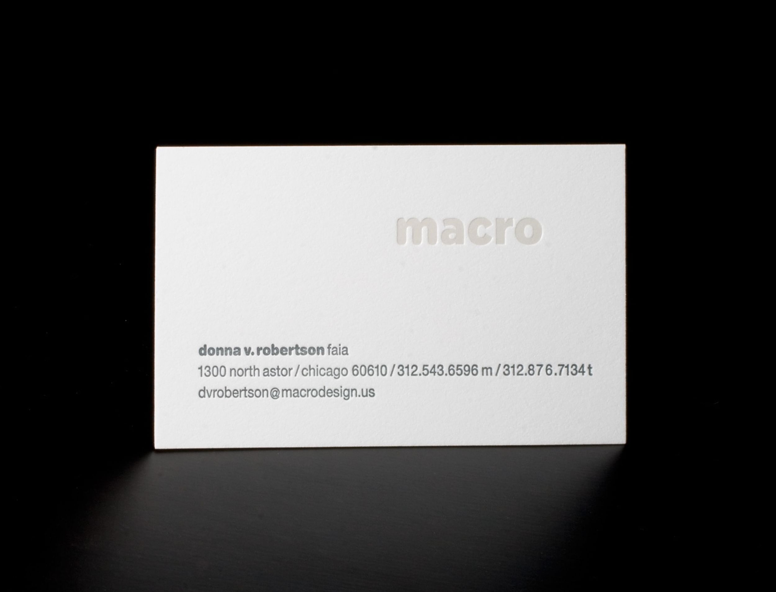 Donna Robertson, former dean of IIT's College of Architecture and her husband, Robert McAnulty, architect, educator, and writer, have joined their professional expertise under one architecture consultancy named MACRO. Thirst designed the identity and business card impression.