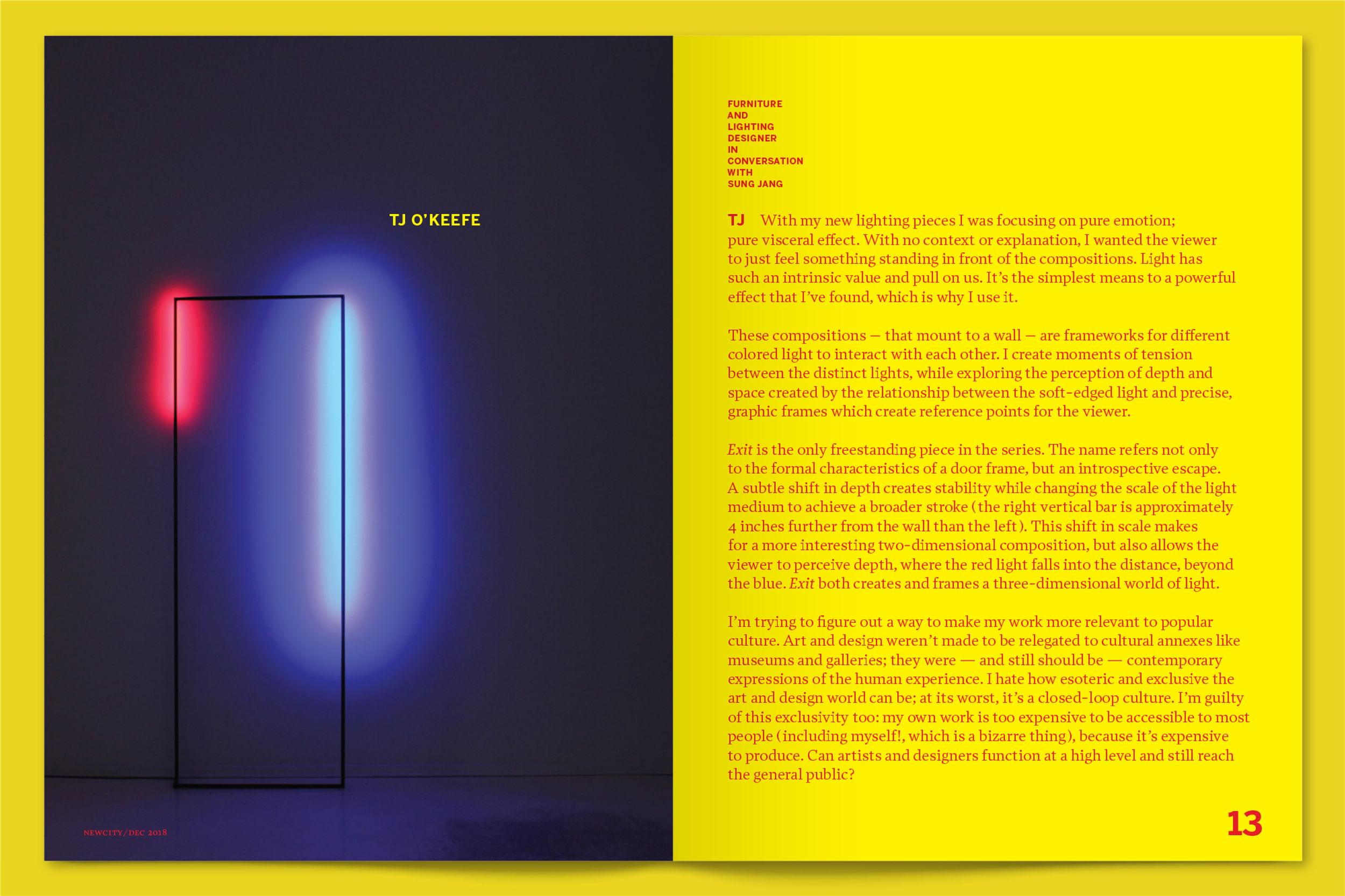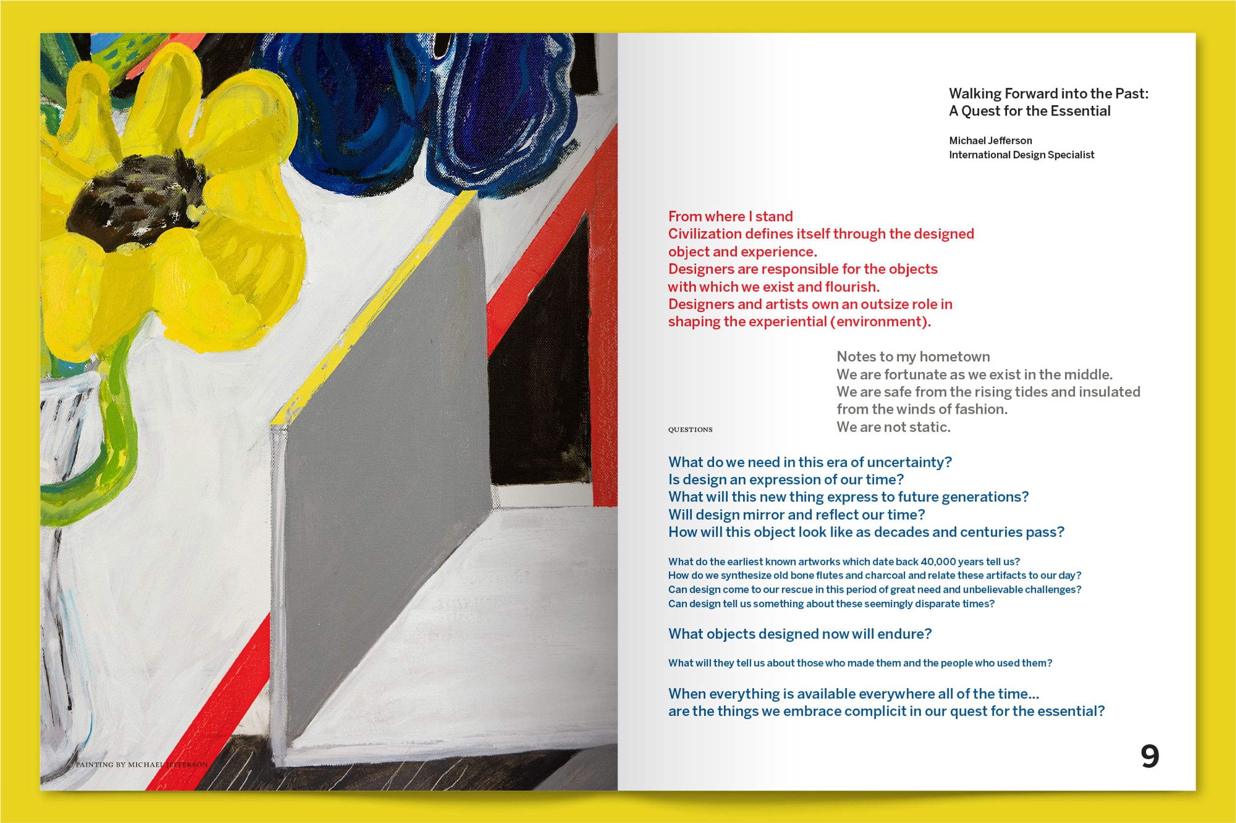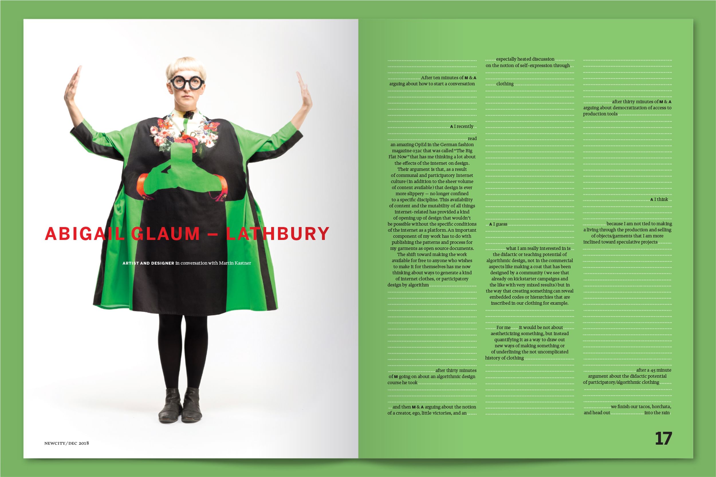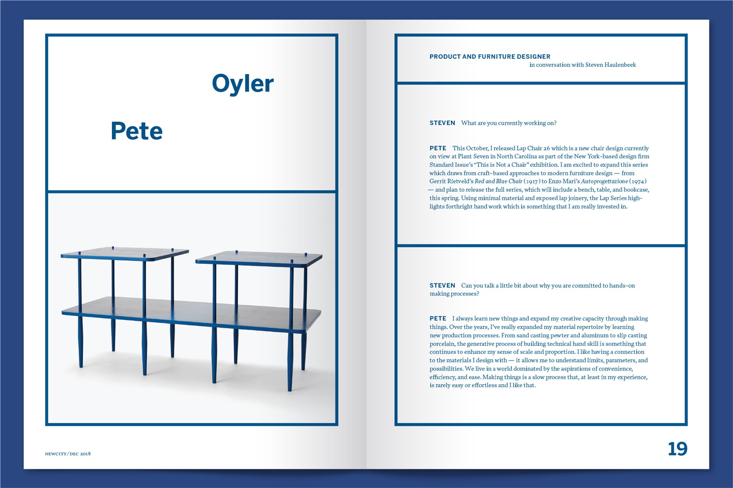Each year we basically turn over the entire December feature to Thirst who shifted the entire POV this year in a novel direction away from the “usual” Newcity approach. Thirst took it another step this year, by asking designers they had selected over the last two years to identify a designer and then engage in conversation. This bent our curatorial process further from the center. Rick invited Michael Jefferson to contribute an introduction and one of his paintings for the cover. ” — Brian Hieggelke, Publisher, Newcity
