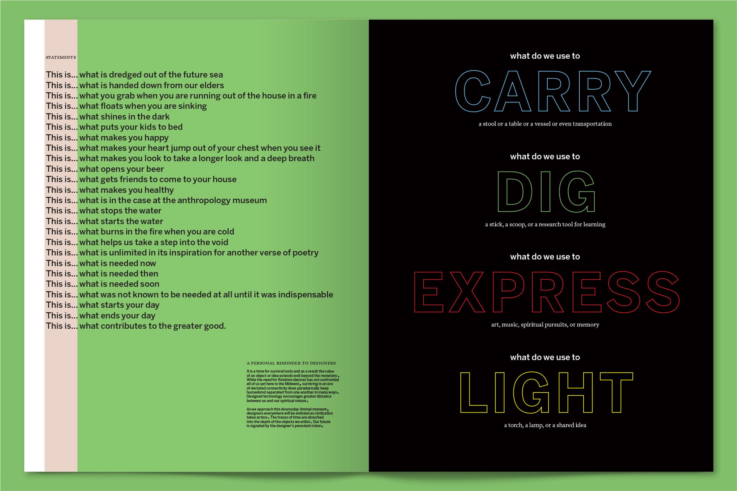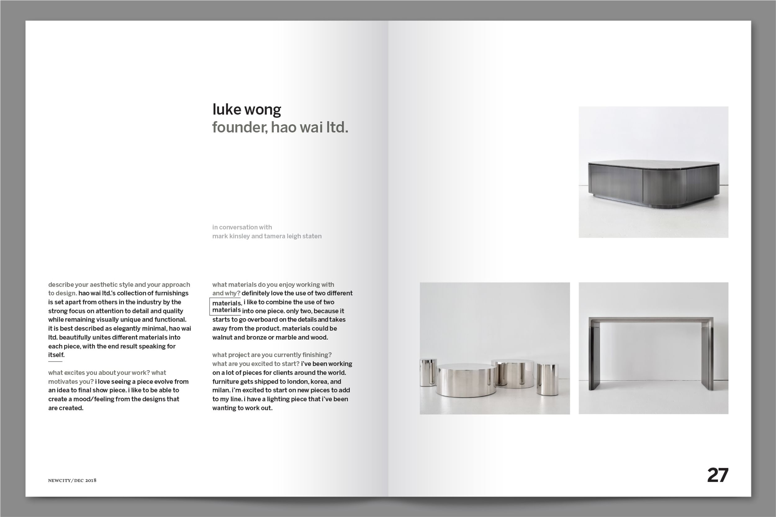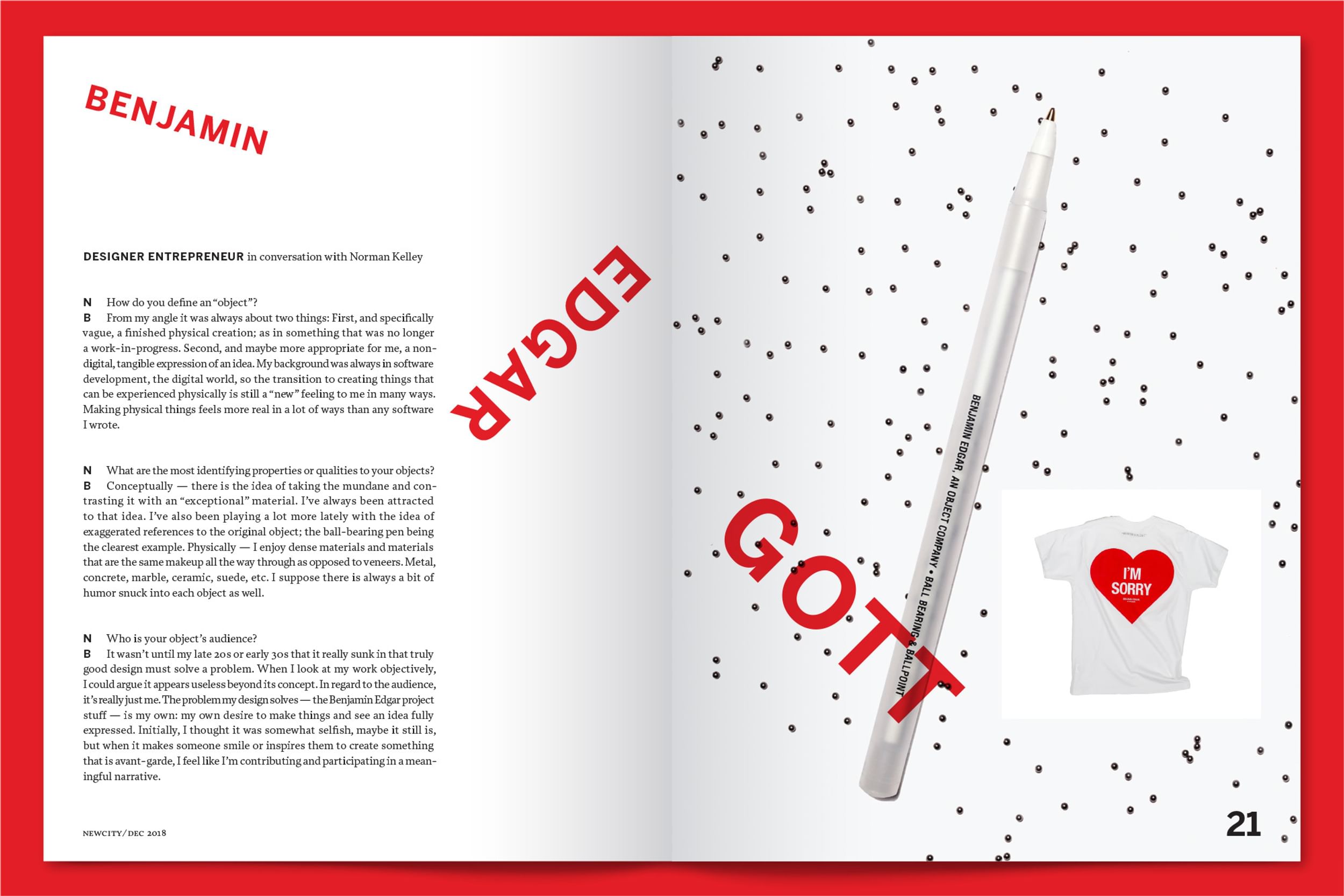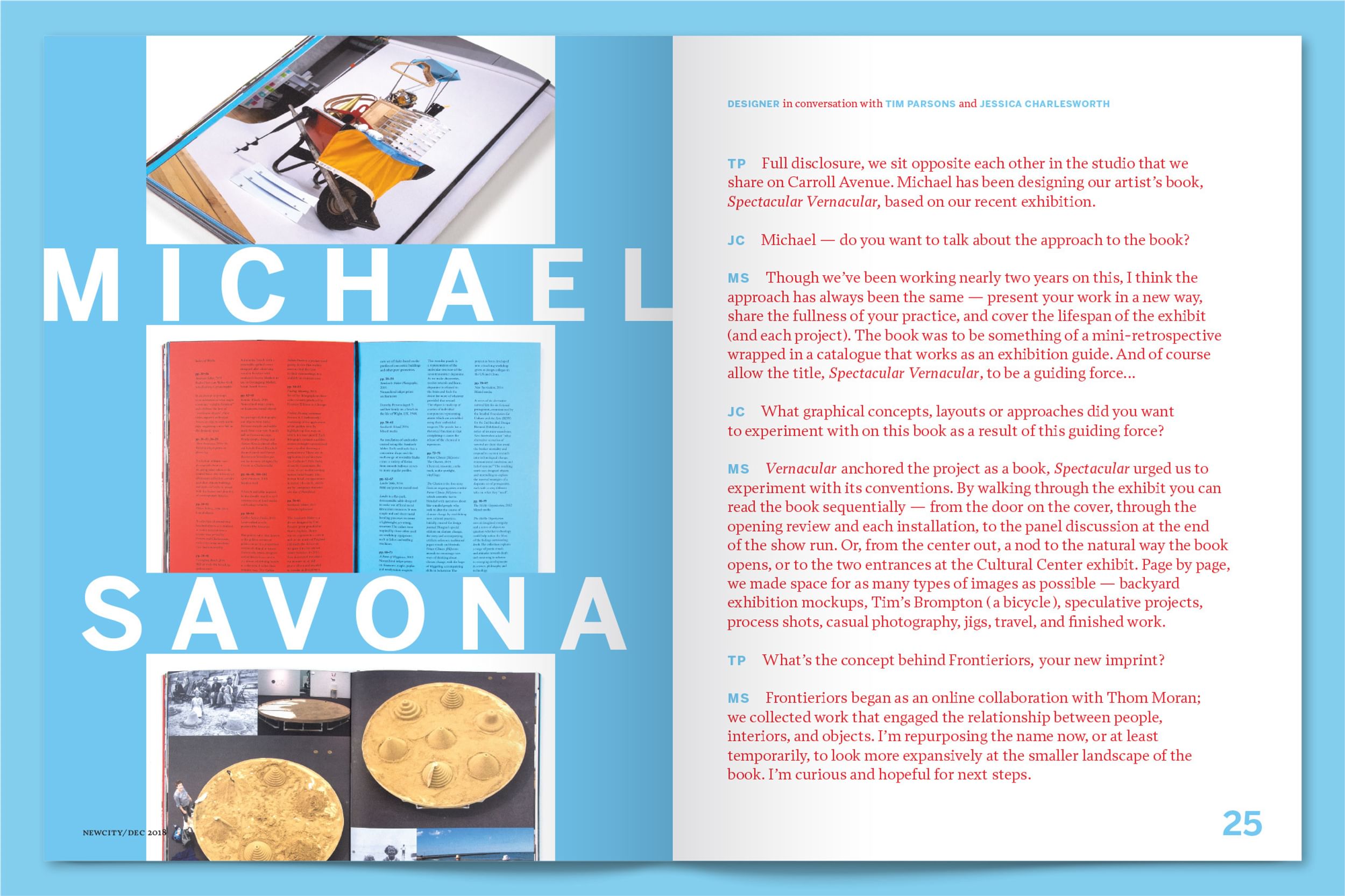 Each year we basically turn over the entire December feature to Thirst who shifted the entire POV this year in a novel direction away from the “usual” Newcity approach. Thirst took it another step this year, by asking designers they had selected over the last two years to identify a designer and then engage in conversation. This bent our curatorial process further from the center. Rick invited Michael Jefferson to contribute an introduction and one of his paintings for the cover. ” — Brian Hieggelke, Publisher, Newcity