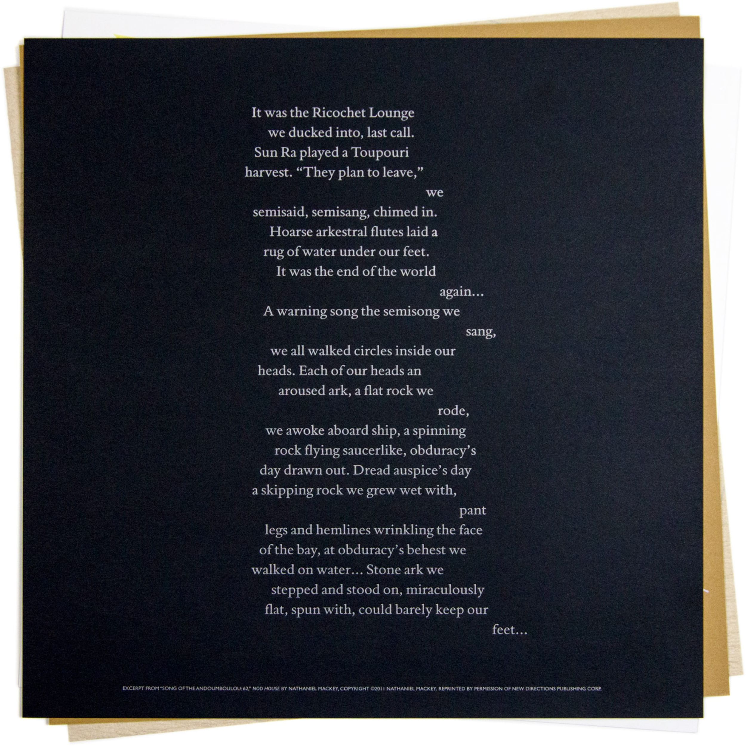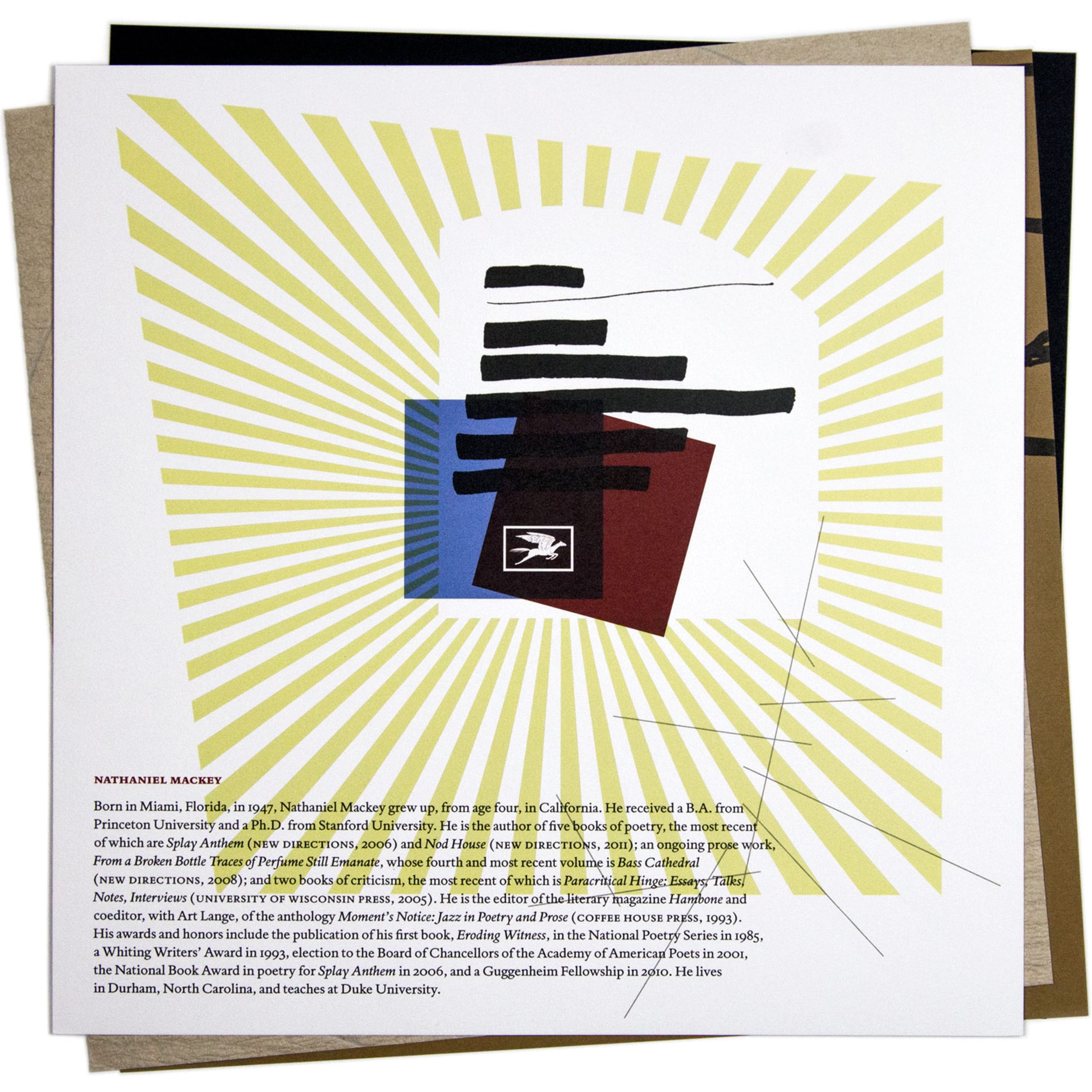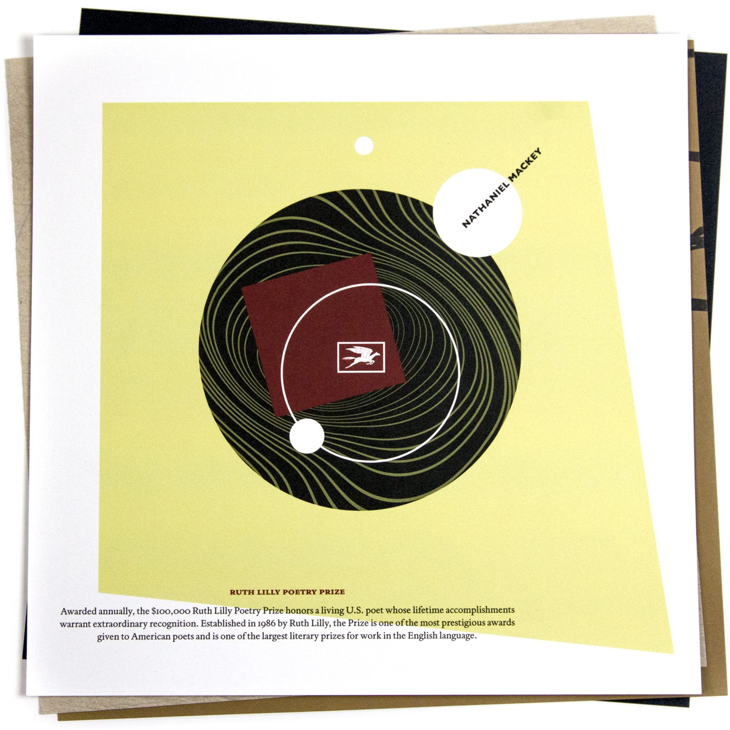 To acknowledge the 2014 Poetry Foundation Pegasus Awards celebrating Nathaniel Mackey, recipient of the Ruth Lilly Poetry Prize, Rick Valicenti responded with a limited edition 12 x 12" broadside set for banquet attendees. Mackey's interest in the Sun Ra canon provided Valicenti a point of departure. The published settings of Mackey poems along with the Poetry Foundation's graphic guidelines designed by Winterhouse, served as visual boundaries.