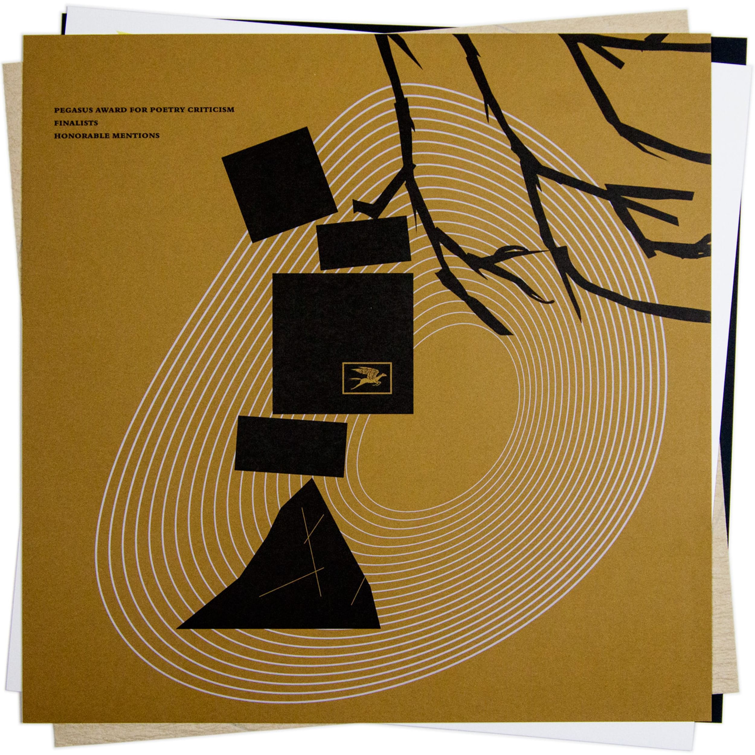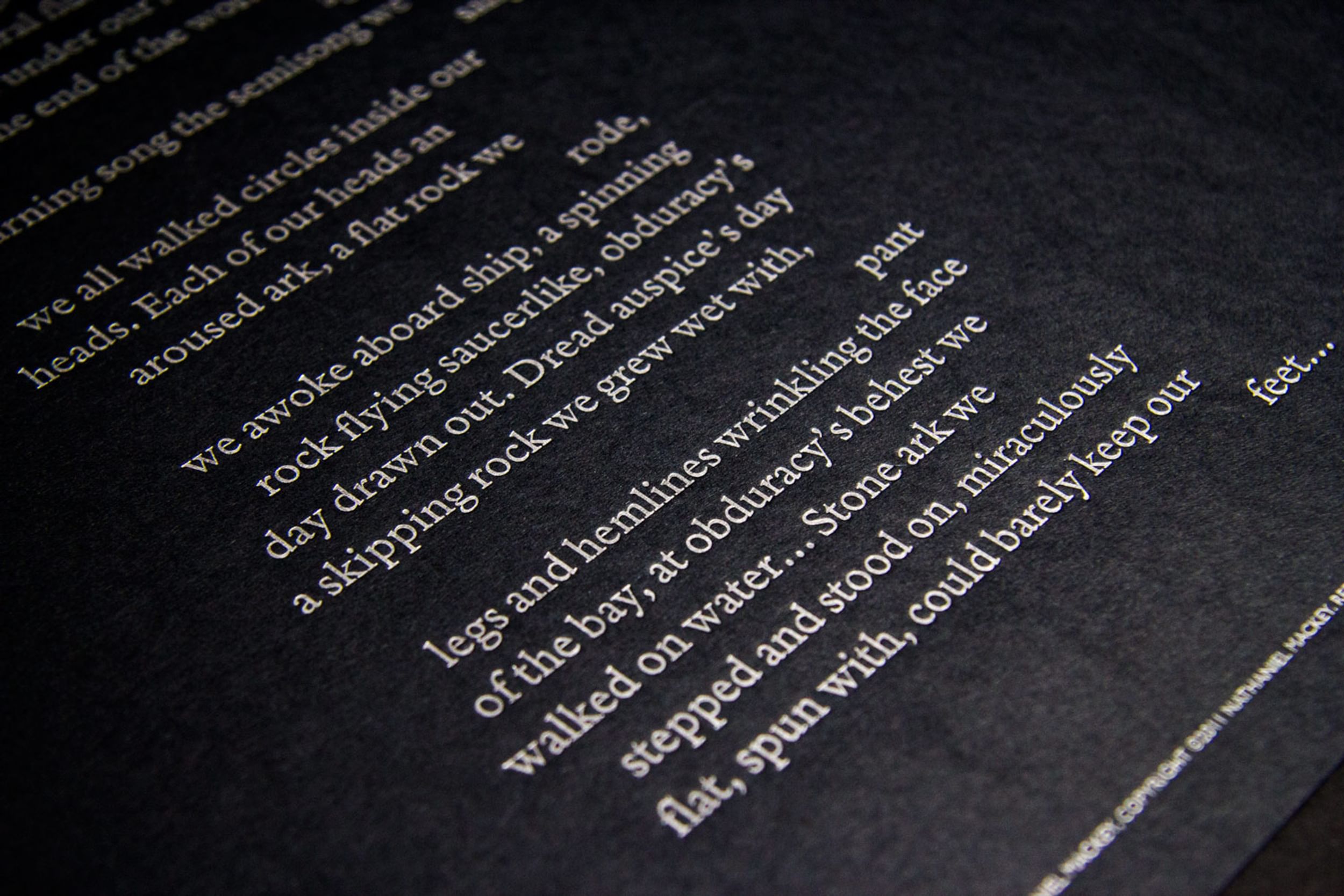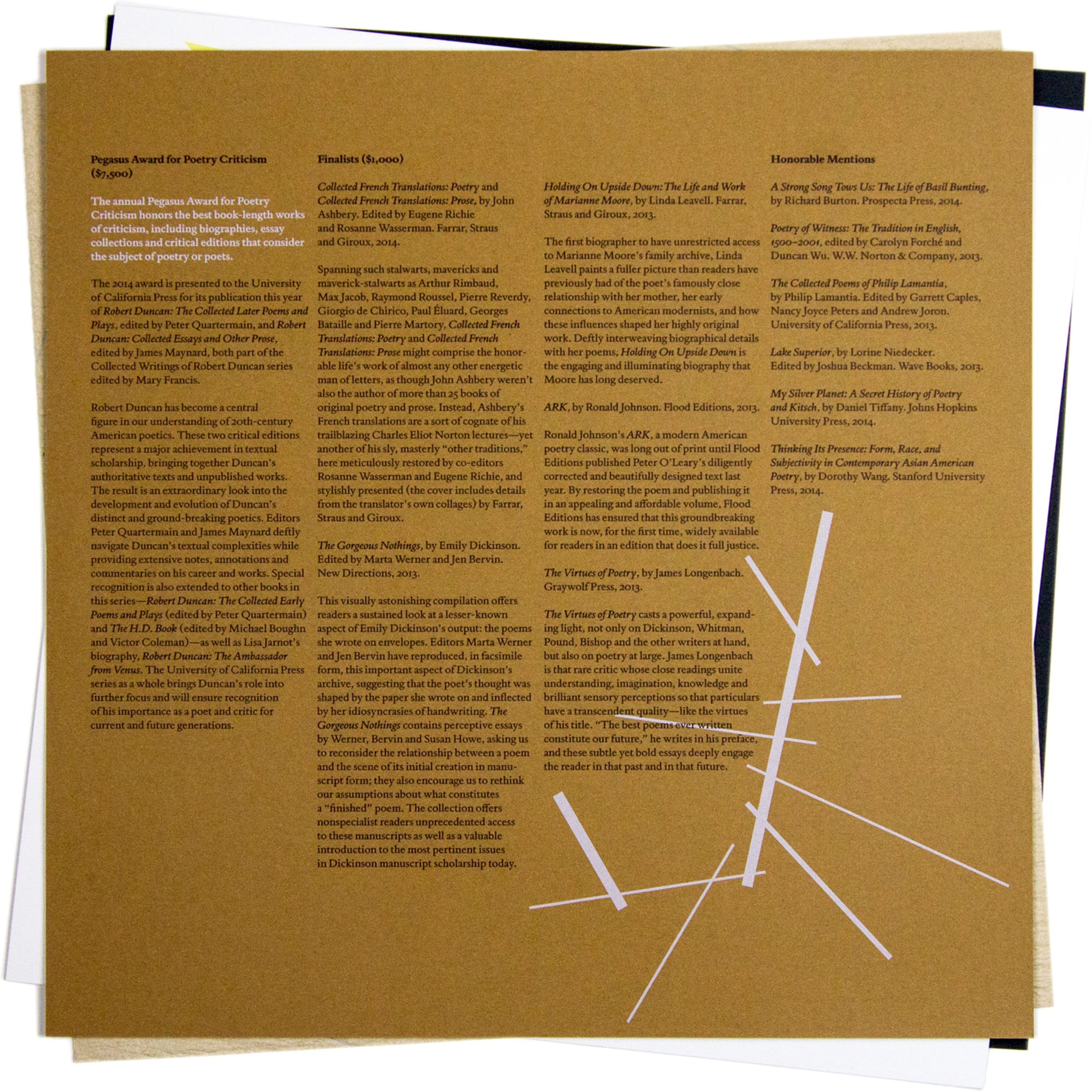 To acknowledge the 2014 Poetry Foundation Pegasus Awards celebrating Nathaniel Mackey, recipient of the Ruth Lilly Poetry Prize, Rick Valicenti responded with a limited edition 12 x 12" broadside set for banquet attendees. Mackey's interest in the Sun Ra canon provided Valicenti a point of departure. The published settings of Mackey poems along with the Poetry Foundation's graphic guidelines designed by Winterhouse, served as visual boundaries.