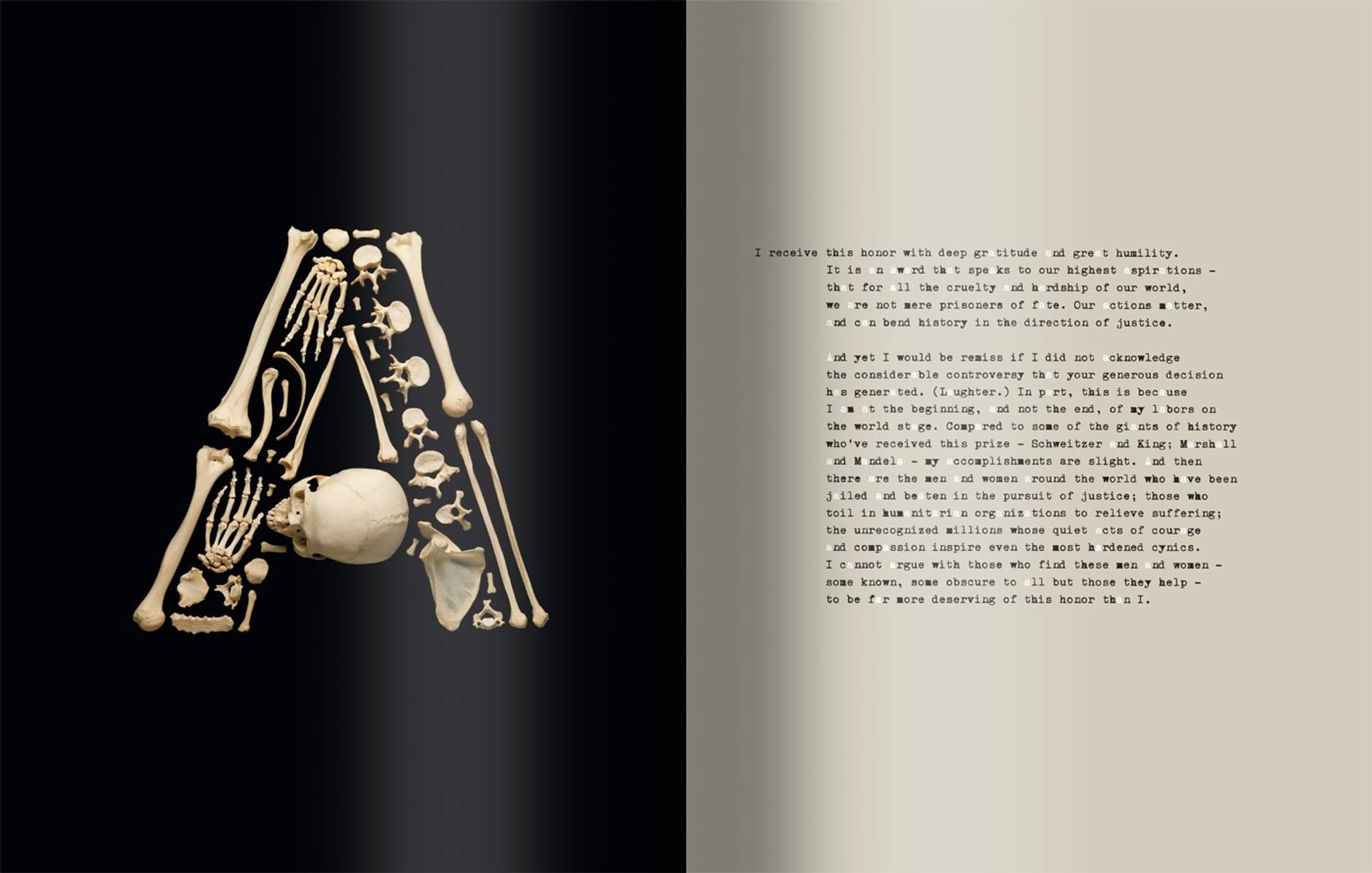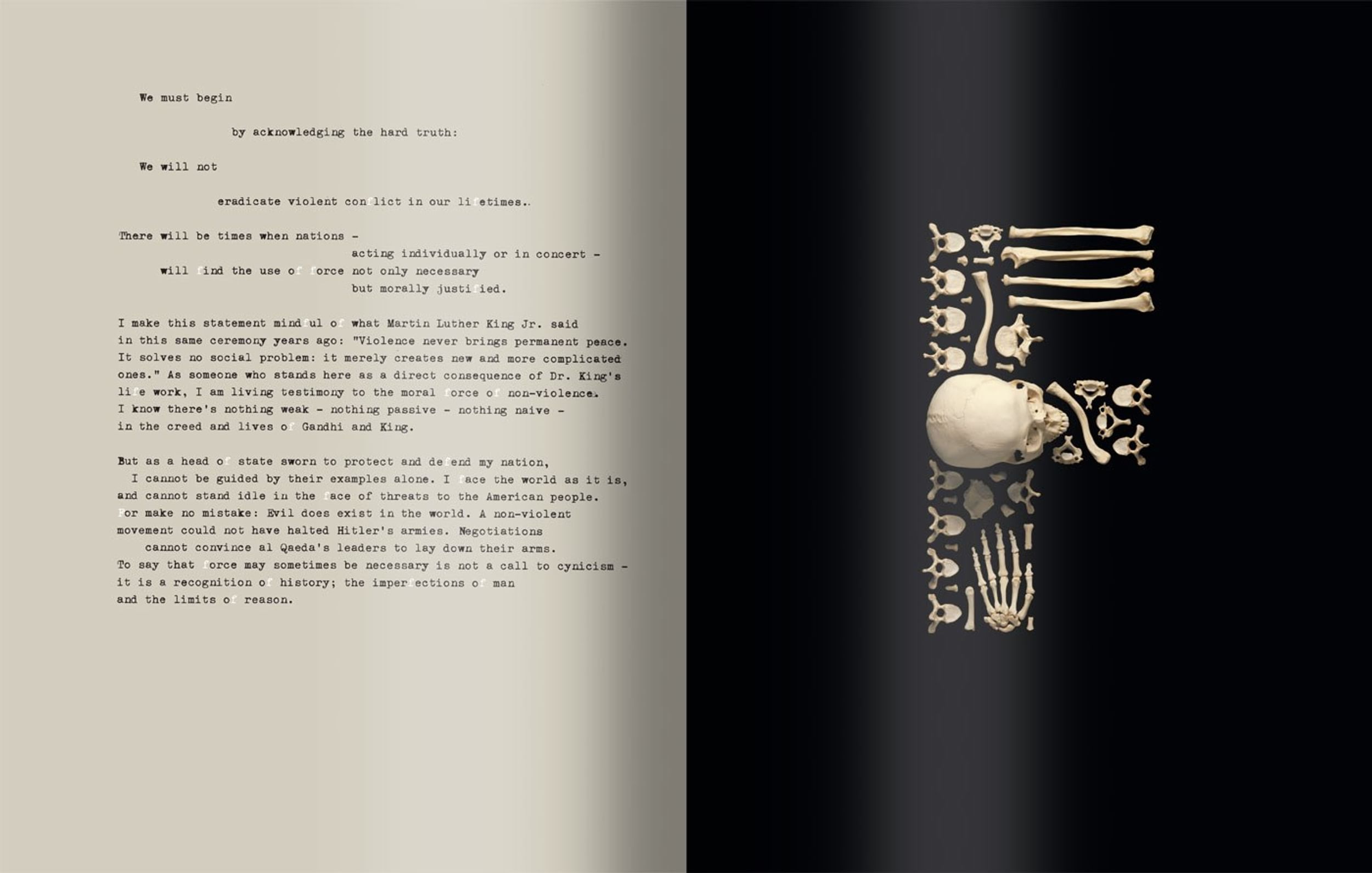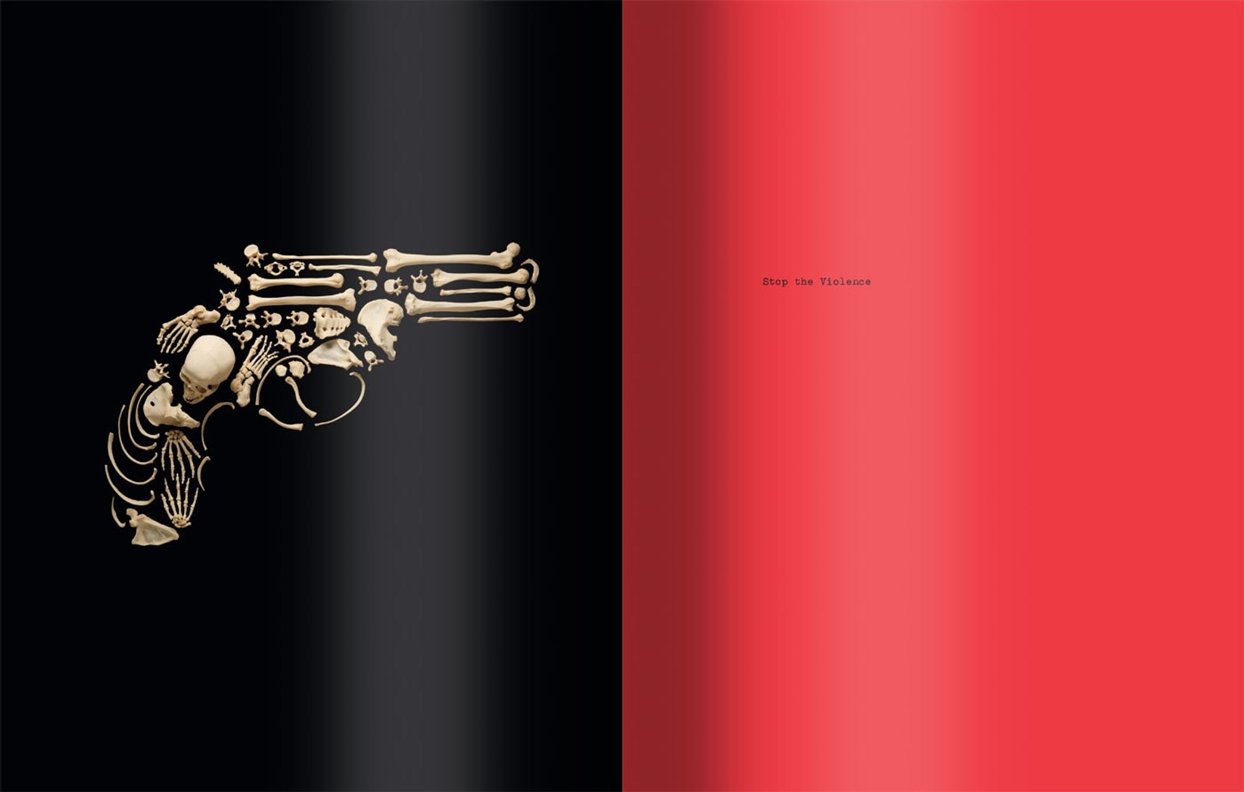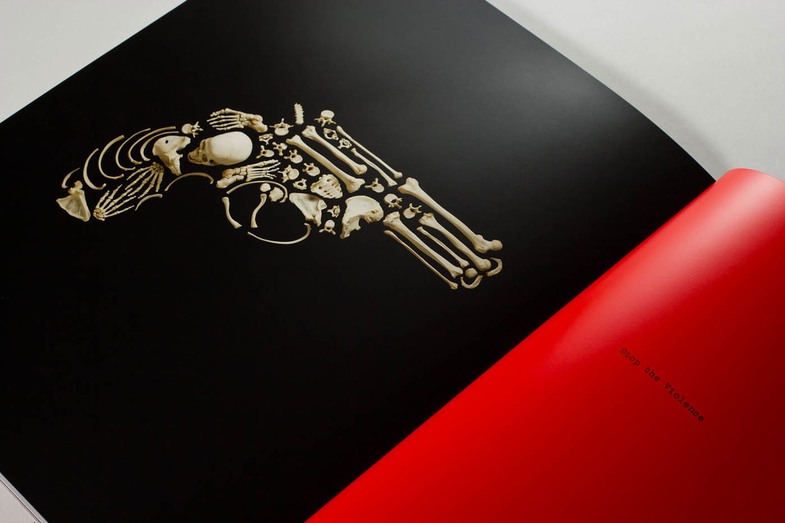 The Stop the Violence book and short film were produced to promote Classic Color's 8-color UV press. Rick Valicenti's design juxtaposes Francois Robert's photographic alphabet with President Obama's speech upon receiving the Nobel Peace Prize set with a strike-on typewriter which filled the Thirst studio with sonic rounds of editorial gunfire.