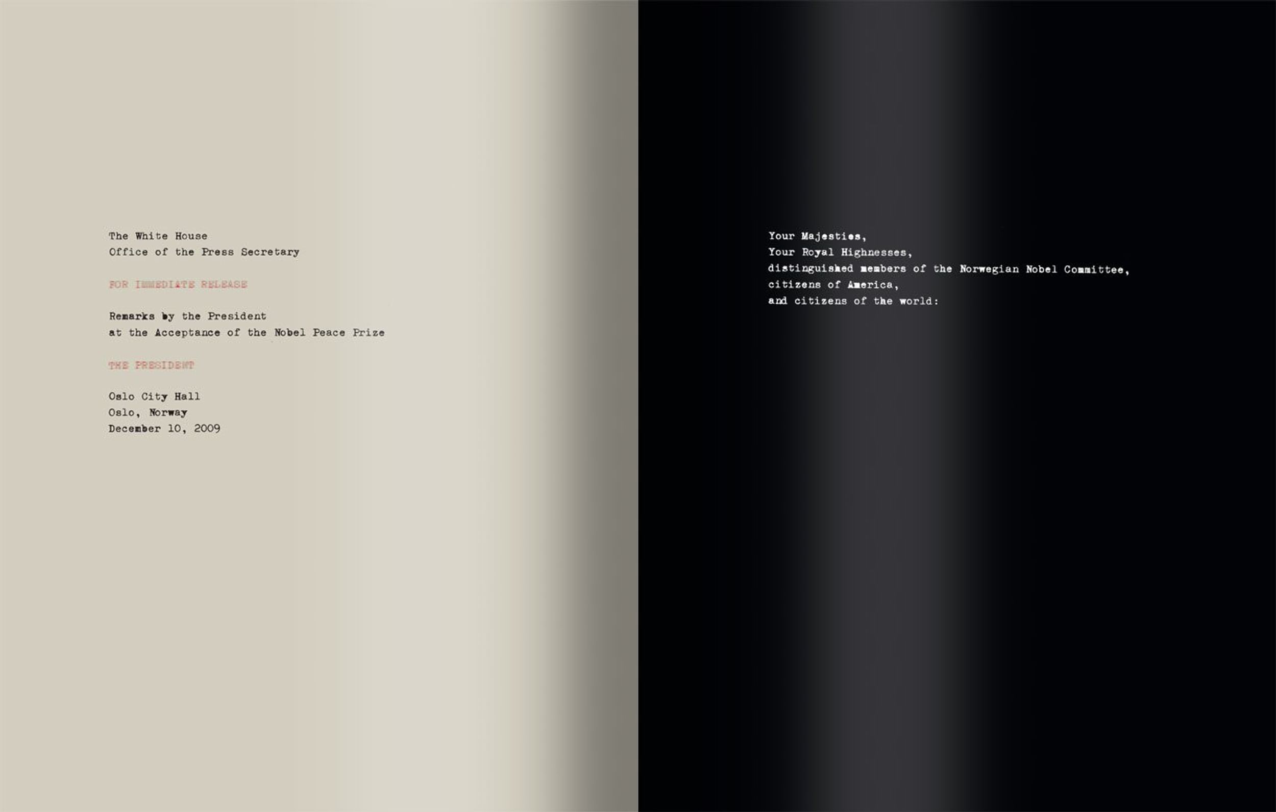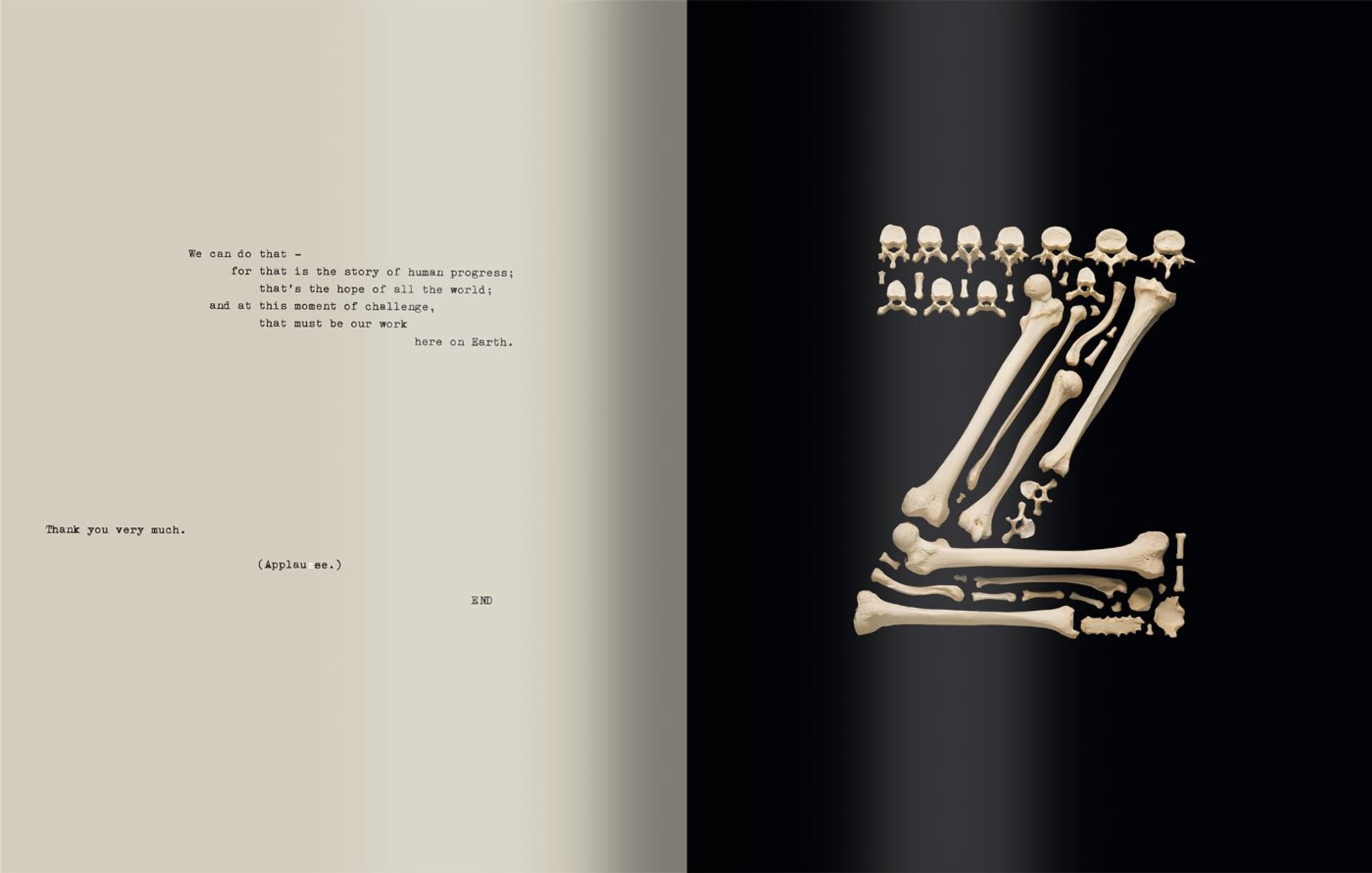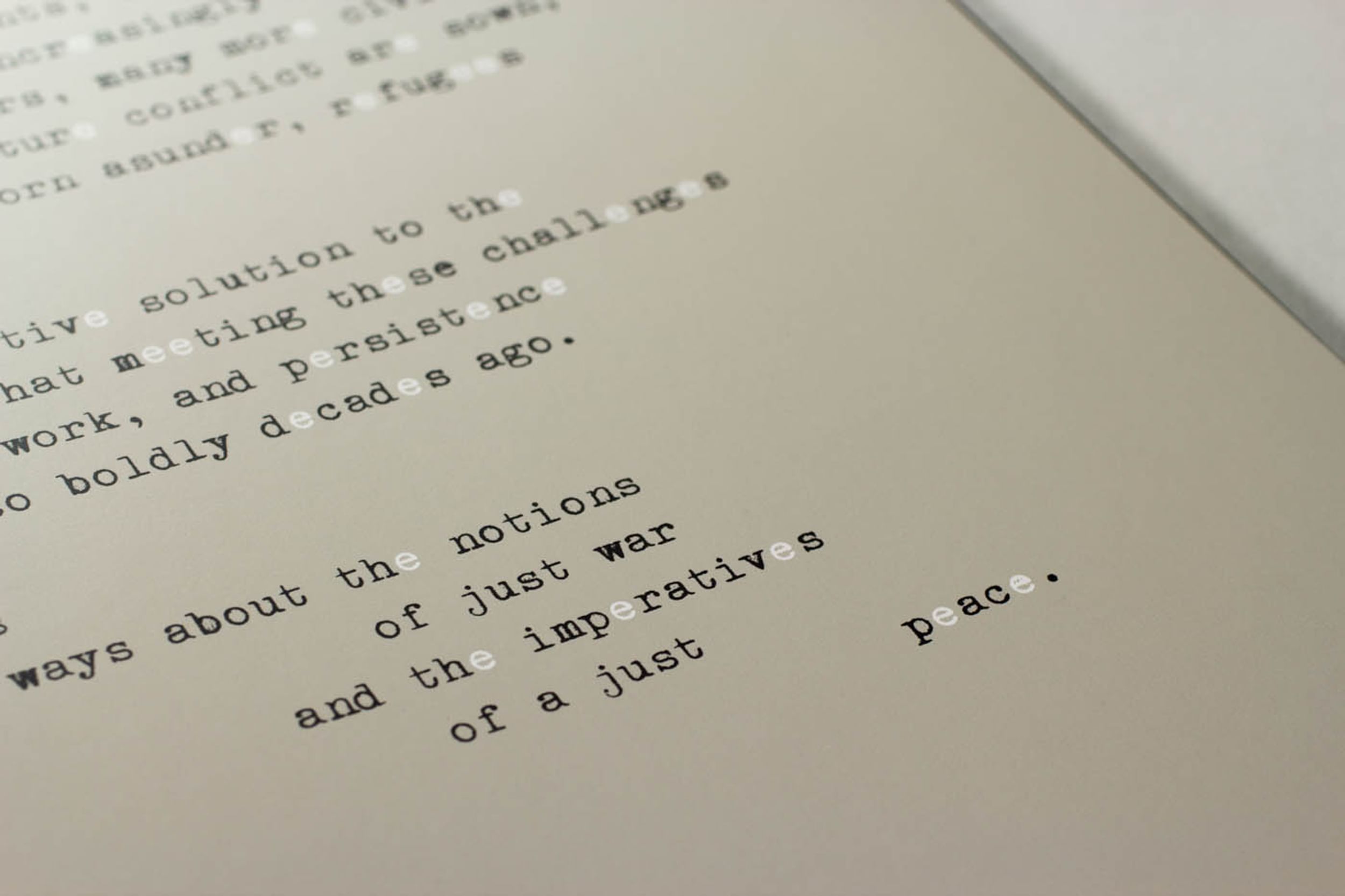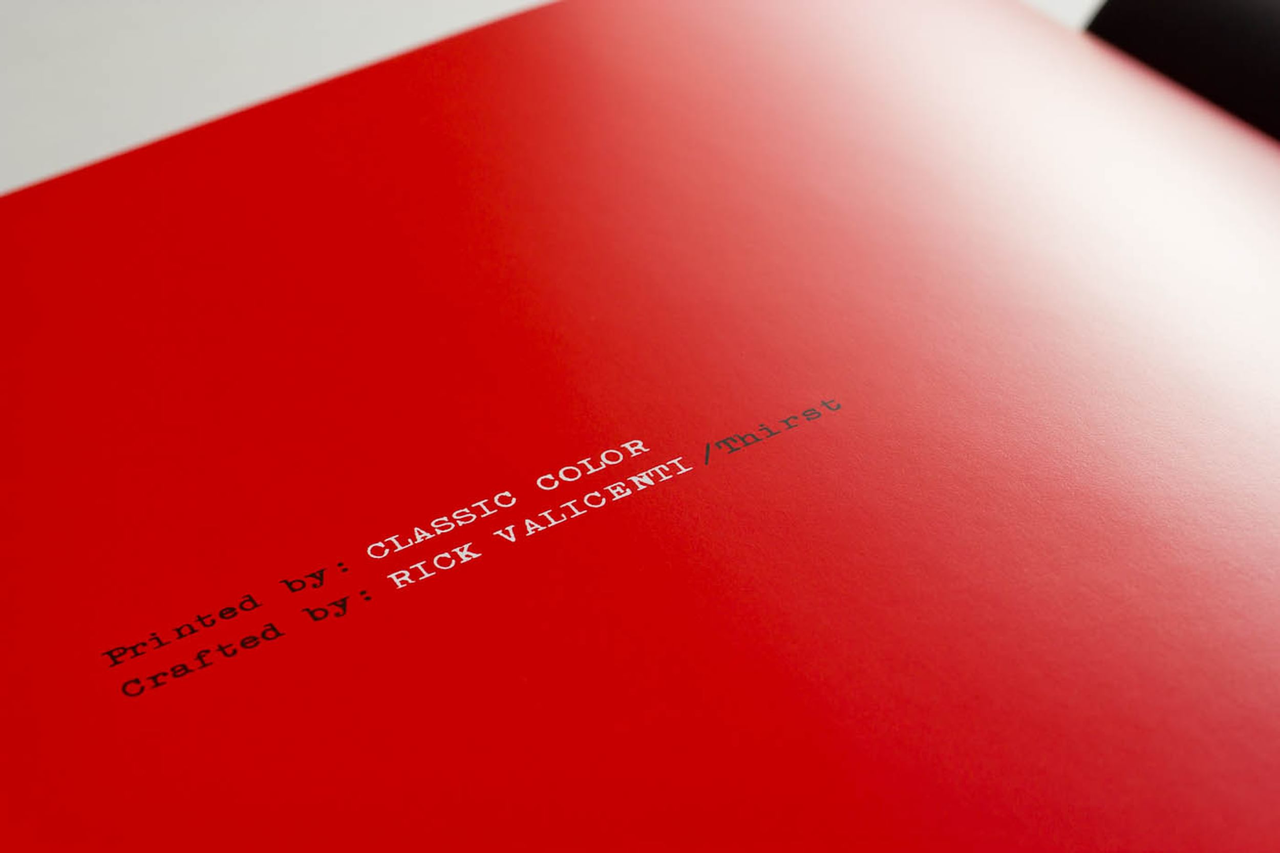 The Stop the Violence book and short film were produced to promote Classic Color's 8-color UV press. Rick Valicenti's design juxtaposes Francois Robert's photographic alphabet with President Obama's speech upon receiving the Nobel Peace Prize set with a strike-on typewriter which filled the Thirst studio with sonic rounds of editorial gunfire.