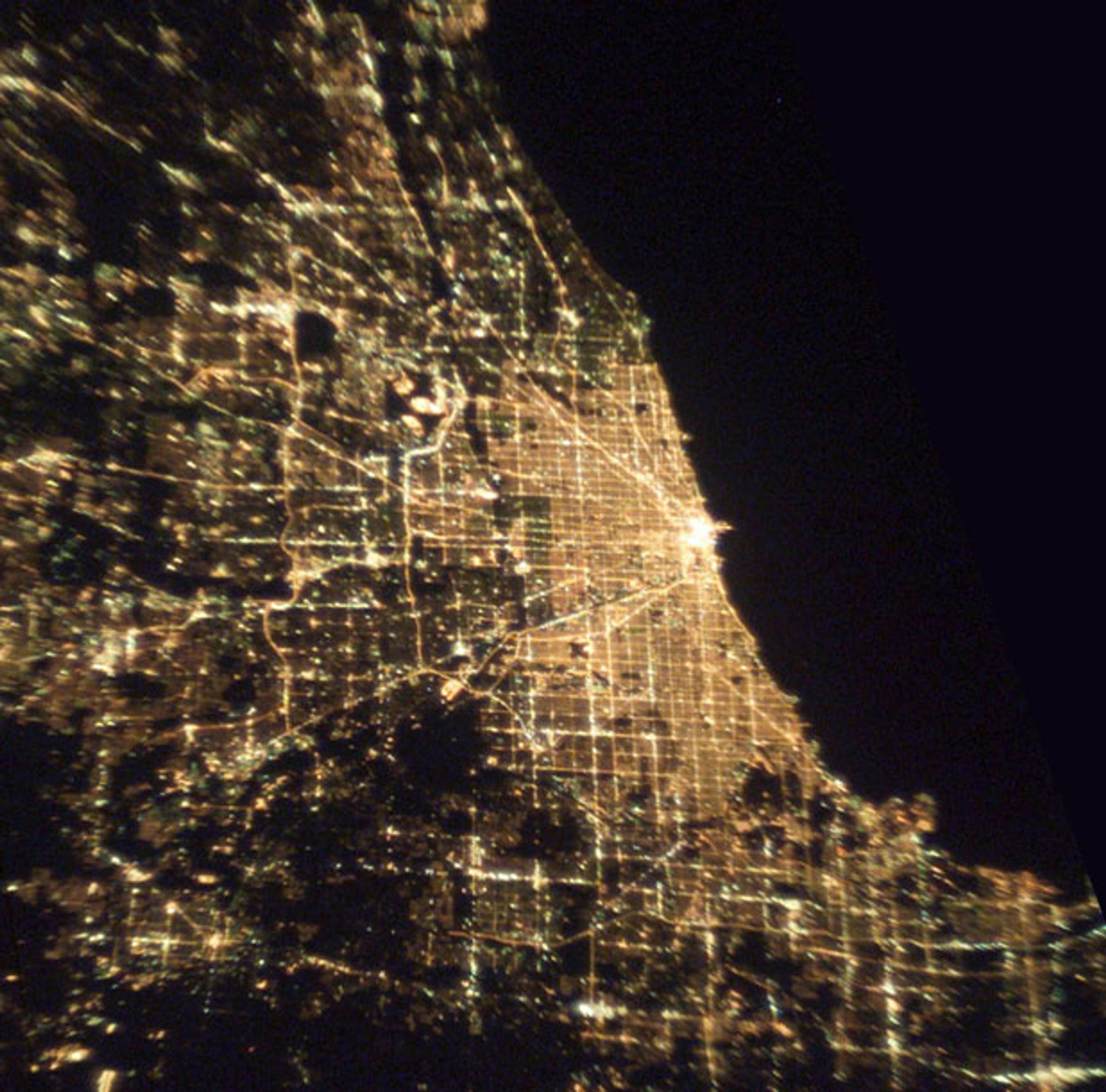 The color palette for the entry wall is taken from a NASA satellite image of Chicago at night: everything is a glow in tans, browns, and golds.