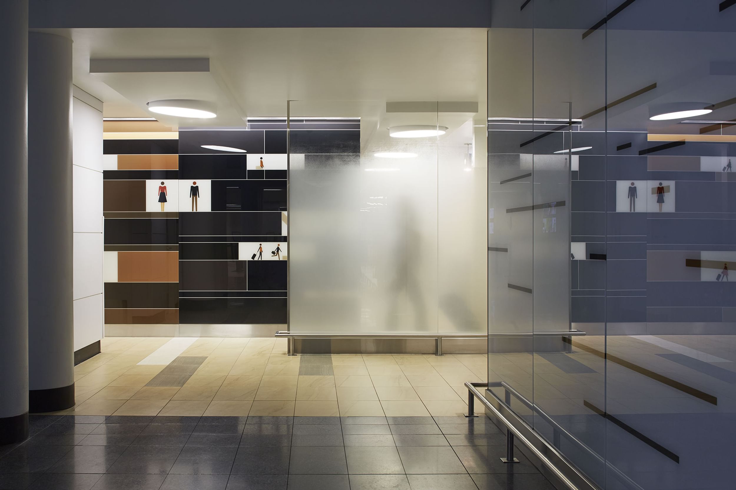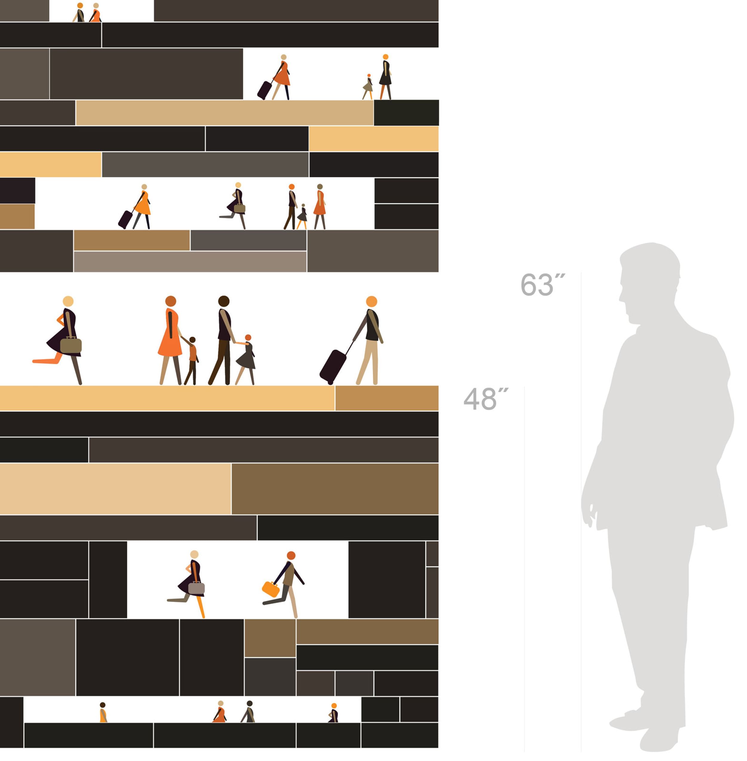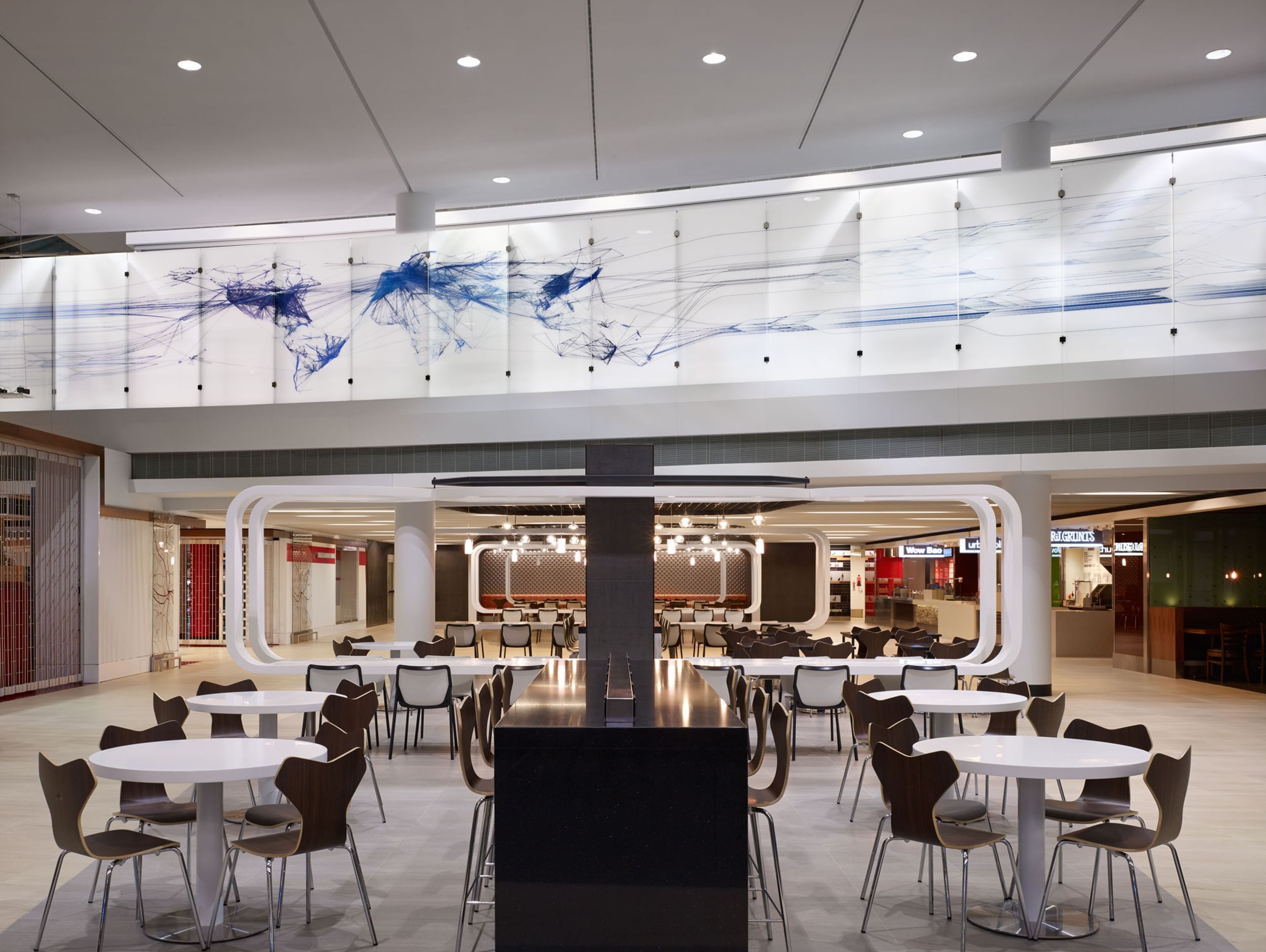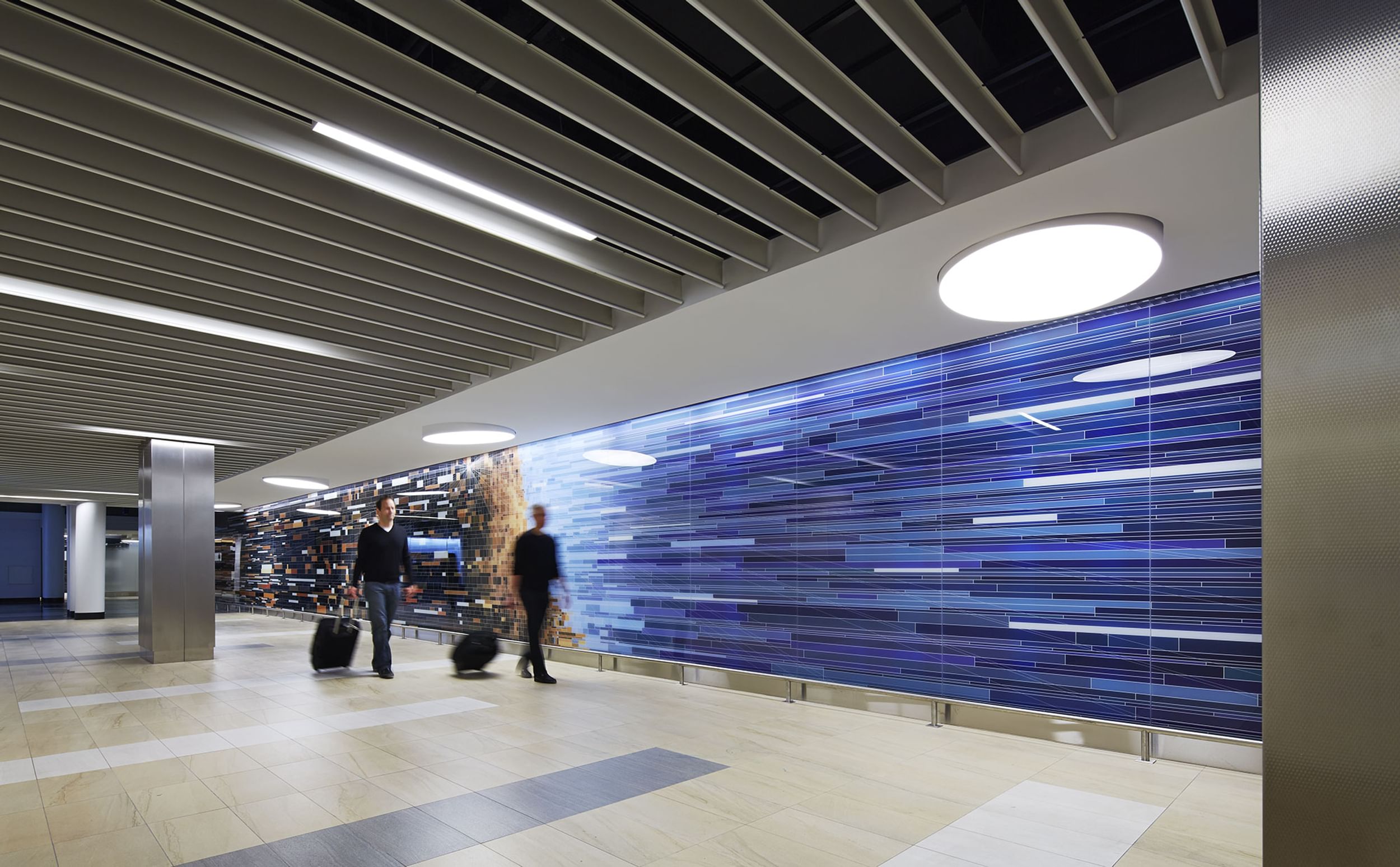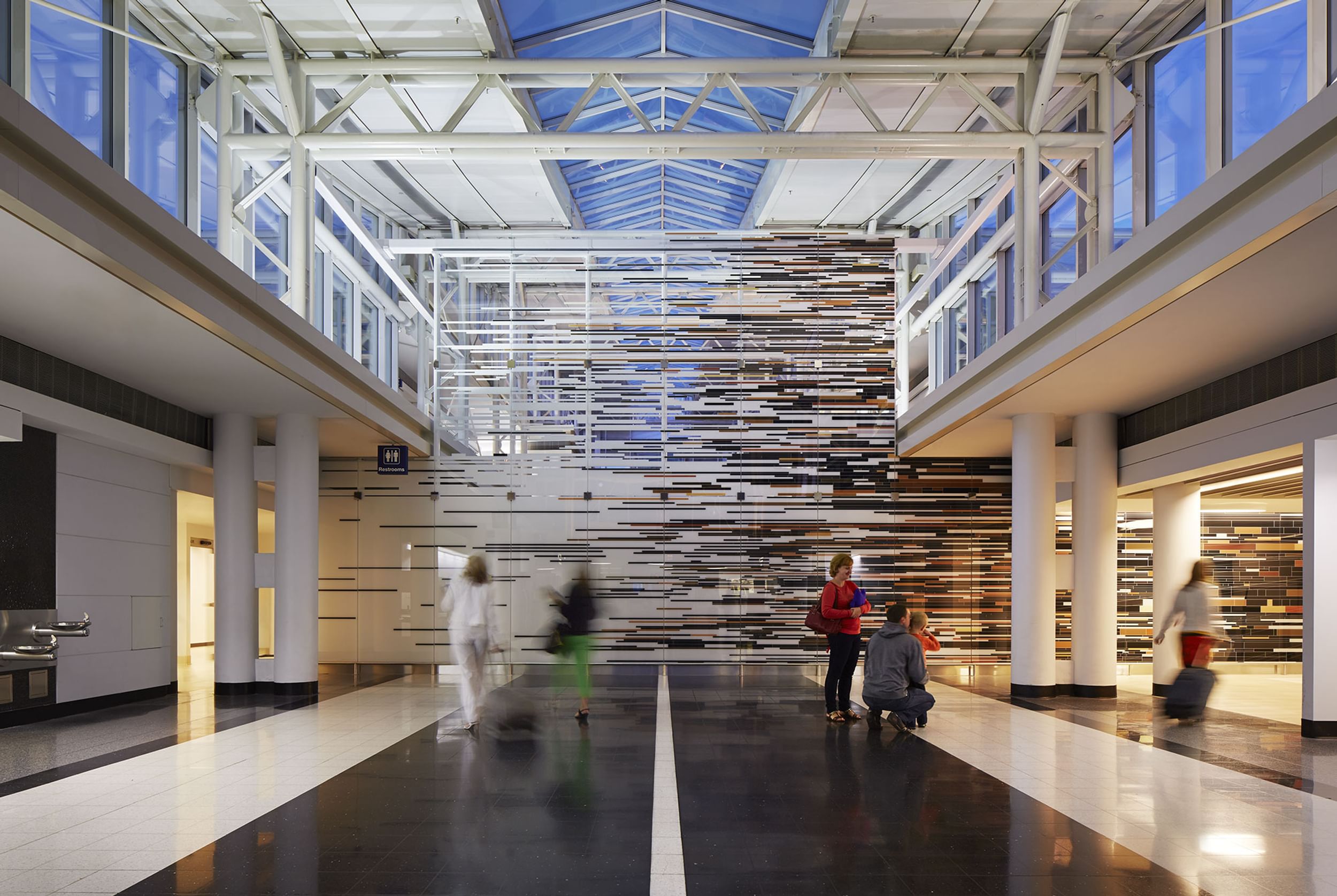 Thirst, led by John Pobojewski, imagined a unique statement that is at once visual tapestry and guidepost. The composition guides traffic to the right into the security queue with kinetic motion while surprising and delighting visitors with a reminder of where they've been and where they are going.