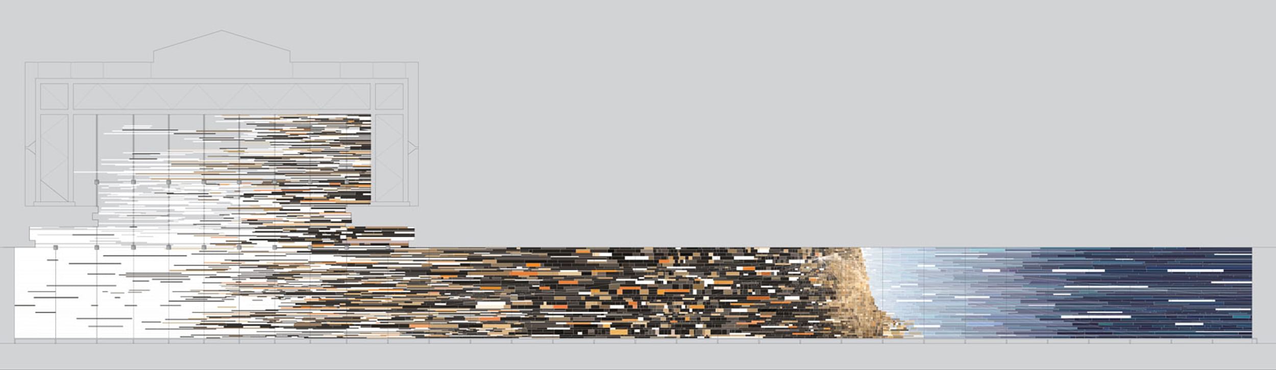 The underlying grid for the entry wall is based on Chicago’s primary street grid.