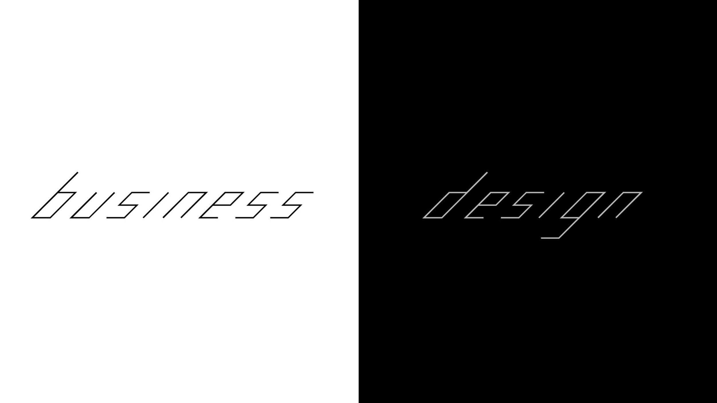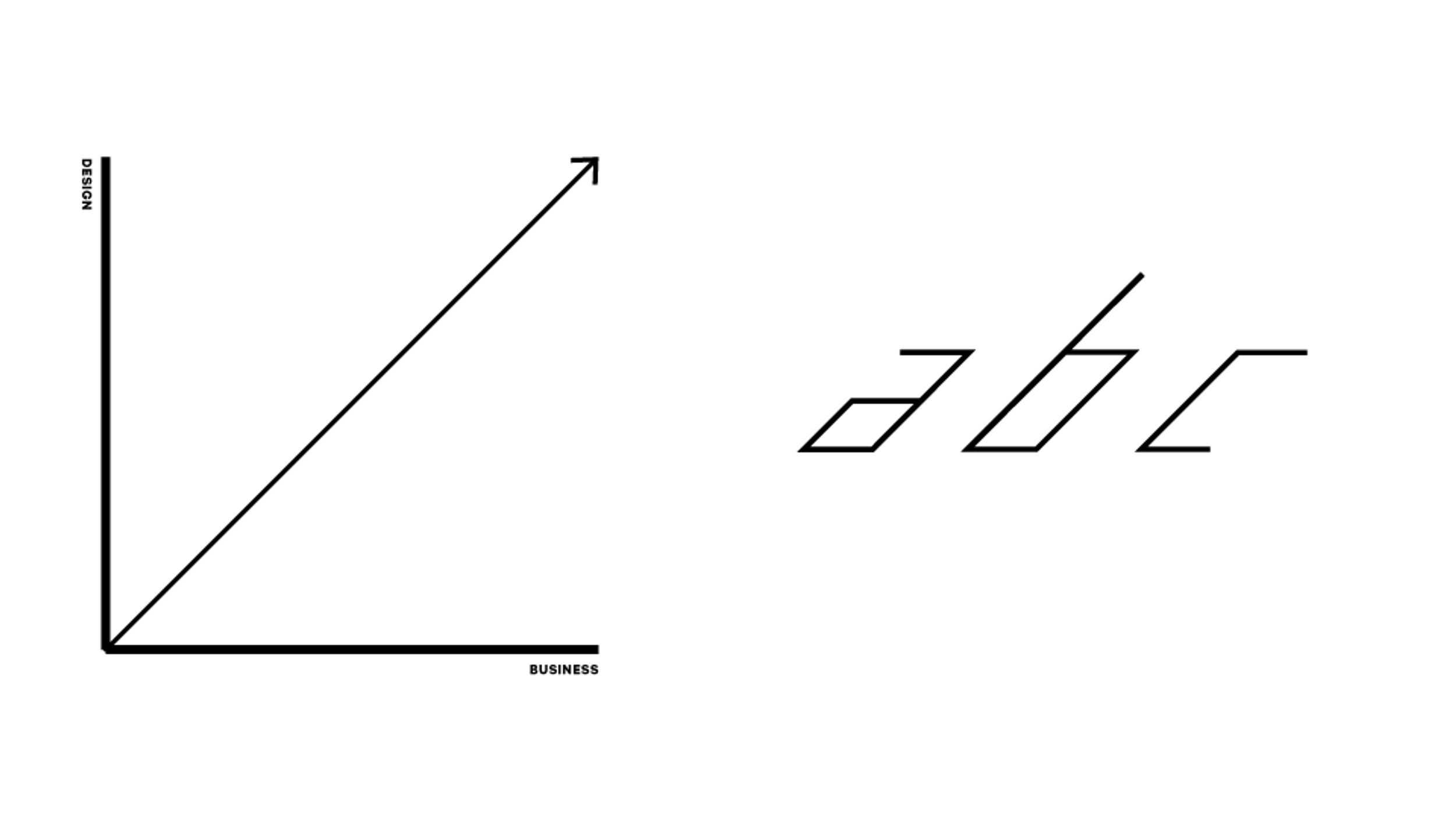 A custom alphabet is used for all messaging, constructed of 45°, 90°, and 180° angles. These three lines conceptually represent the worlds of design, business, and the space in between.