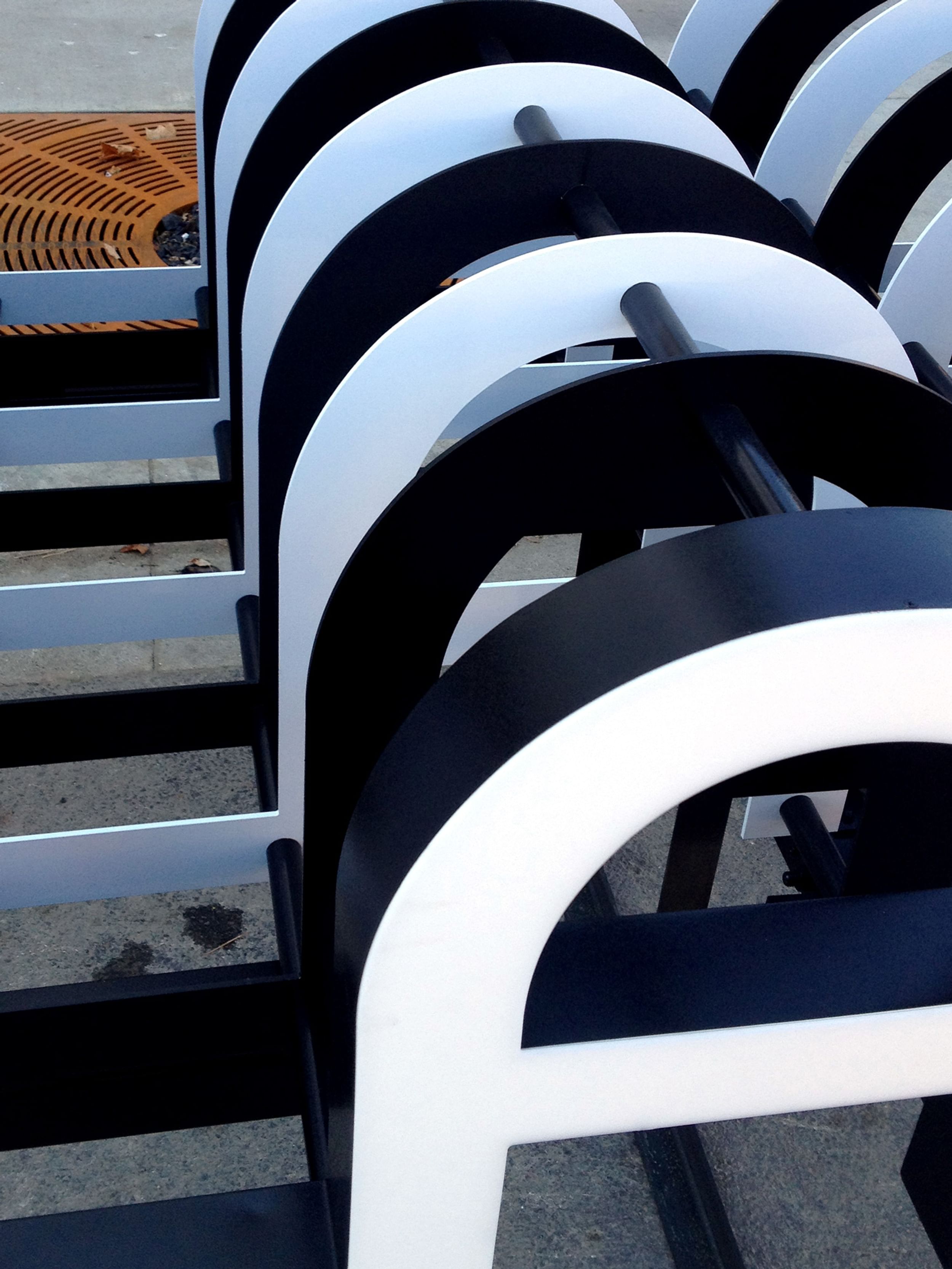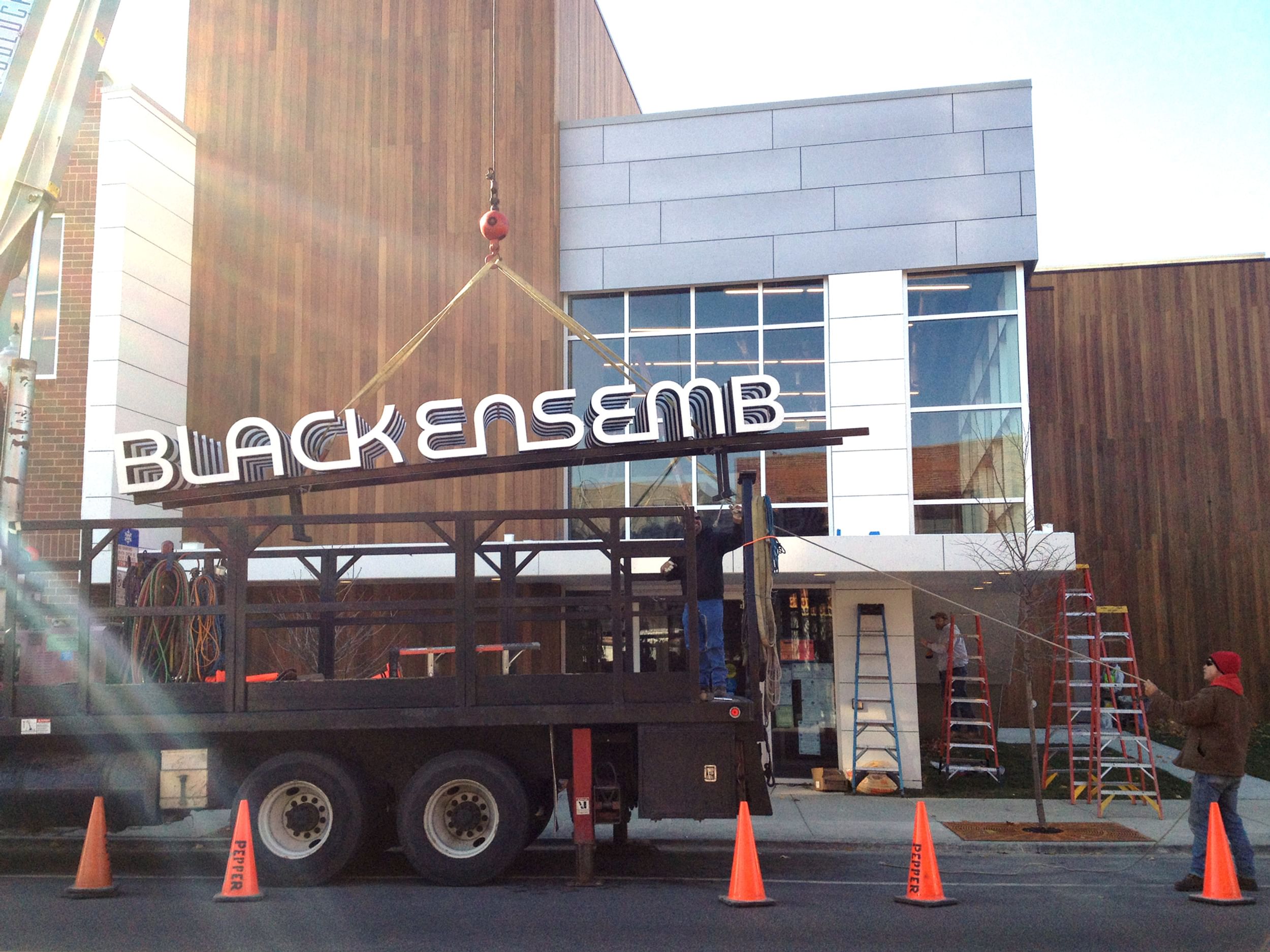 Through explorations of form and the materials available, we arrived at a solution for the canopy sign that slices the 4 foot extrusion into alternating black and white sections. When placed in context, the sign becomes another reminder of the Theater's mission to eradicate racism through the utilization of theater arts.