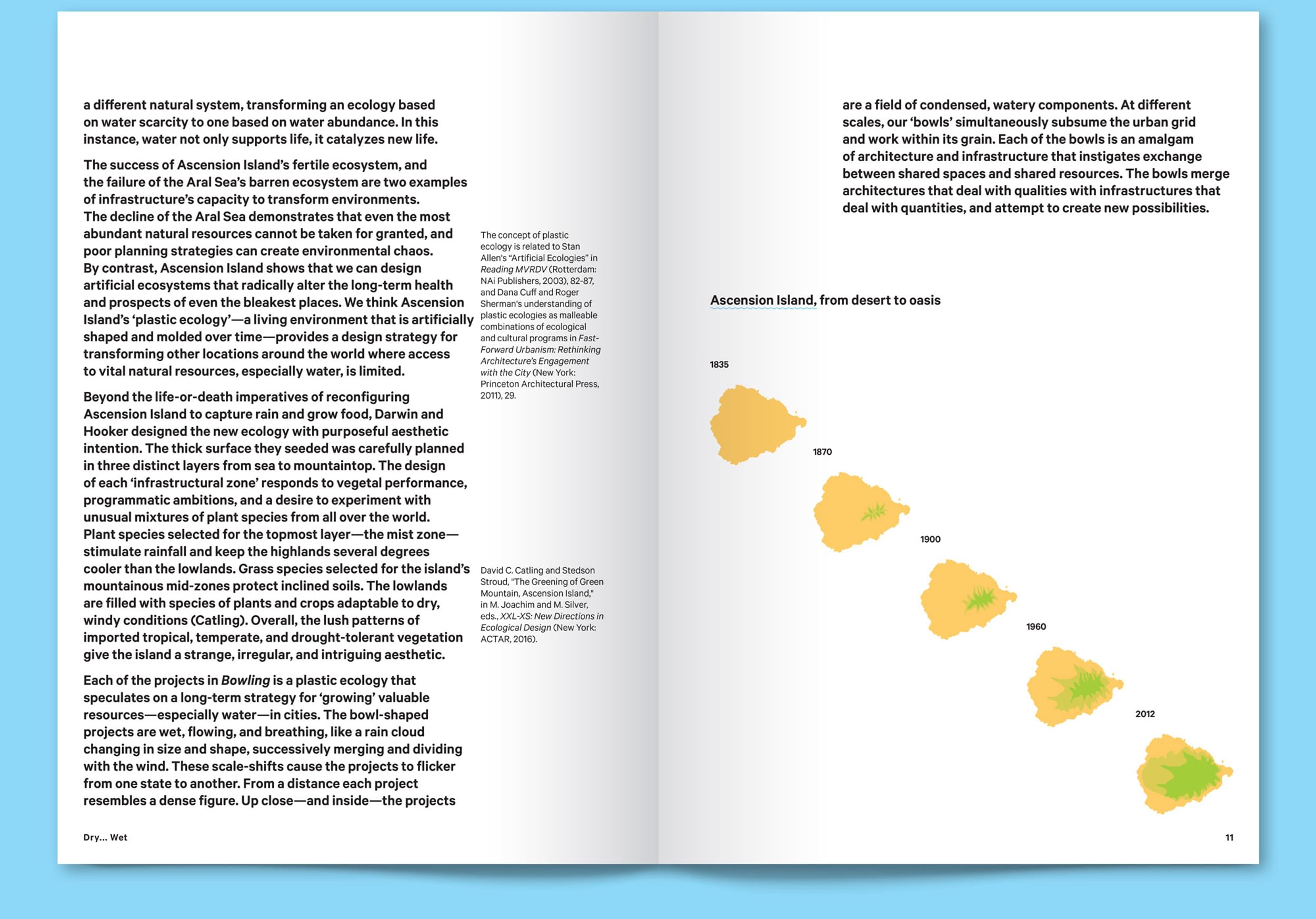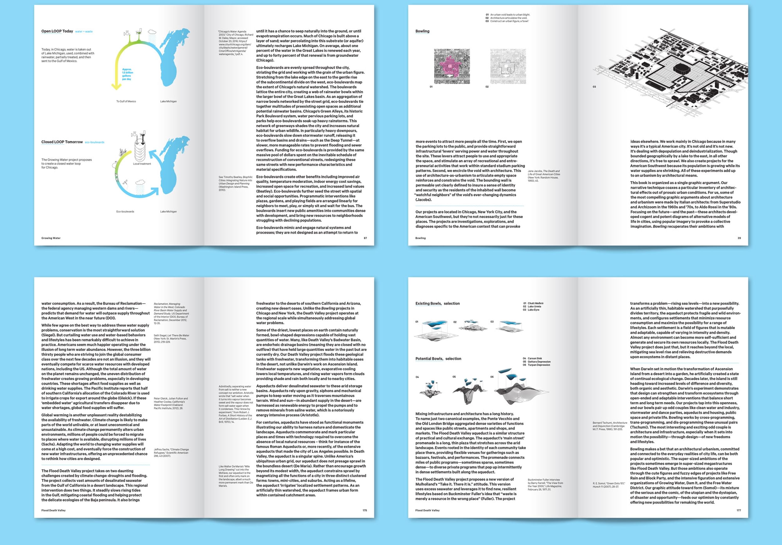 * Bowling: Water, Architecture, Urbanism asks: Why, as a discipline, do contemporary architects counter huge crises with small ideas? Architects once thought and theorized the huge (both huge problems and huge solutions). In addition to unprecedented opportunities to design large-scale public works projects in the postwar period, architects in the 1950s and '60s eagerly took on the large-scale cultural and environmental problems of the day. Bowling seeks to reposition the contemporary debate of what a city should be by exploring how city-scaled mega-forms can become an updated architecture-based urbanism—a conjecture of what a comprehensible city could be to combat (predicted) crises—through analysis and experimentation. Through the filter of productive contemporary crises, the urban-scaled architecture project can engage and exploit existing infrastructural conditions as a catalyst for urban invention.”